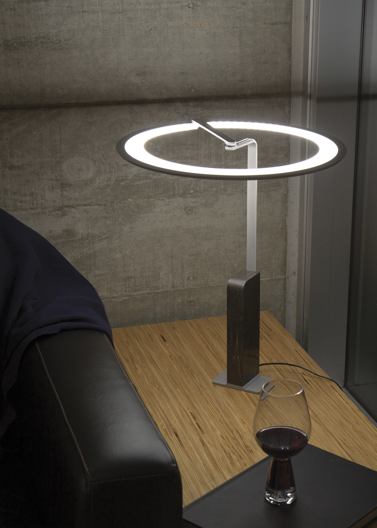 Using io Lamp is a performance. The simple, logical and expressive interactions designed into the lamp add an element of theatre to its use. The io Lamp is a visual, tactile and physical experience. This product needs to be touched and handled and rewards the user for doing so with the pleasure that only this type of engagement can bring. The io Lamp’s light-source is an entirely separate component of the base. When the lamp is off, the ring luminaire hangs vertically from the top of the stand. To turn the lamp on, the ring is lifted and balanced horizontally on the stem, placing it on an electrical contact that transfers current. The light output can be dimmed simply by rotating the ring, which can spin freely around the central electrical contact. The io Lamp’s switch was the foundation of the design, from which the form and function of the lamp follow. The switch, while simple to use, requires a certain level of care. This active engagement with the lamp refocuses your attention towards the object and brings your mind into the present moment. The io Lamp’s dramatic form is made possible by today’s LED technology – the impossibly thin ring is a single piece of 6mm aluminium which houses 85 LEDs behind an acrylic diffuser. At its brightest, the ring emits 400 lumens, more than optimal enough for reading. The light can be dimmed to 150 lumens, simply by rotating the ring. Standing at 500 millimetres tall, the light source sits at a comfortable height on most surfaces. The base of the lamp is a combination of marble and aluminium, machined to accommodate the LED driver, thus consolidating mass and enhancing stability.