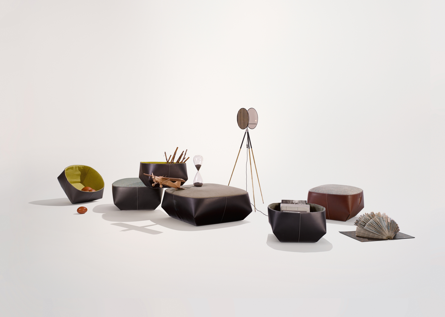 Isanka’s stylistic vocabulary communicates joyful abundance. Thanks to its high-quality artisanal details and decorative colours, the upholstered seat, occasional table and basket harmoniously blend in with different interiors. Natural materials, such as saddle leather and elegant fabrics, give the seat and storage elements their autonomous character. The seating furniture can be flexibly used as a stool or a footrest.