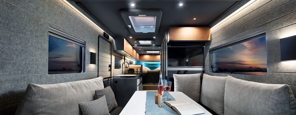 iSmove is a fully integrated motorhome with a light, compact construction that allows for high payloads and attracts attention with its interior design. Thoughtful features such as a lifting kitchen shelf, a rotating belted bench seat or a slim-design lifting bed provide new visual perspectives for the entire vehicle. In combination with the anthracite ceiling, integrated spotlights and a minimalist interior, a homely atmosphere is created.