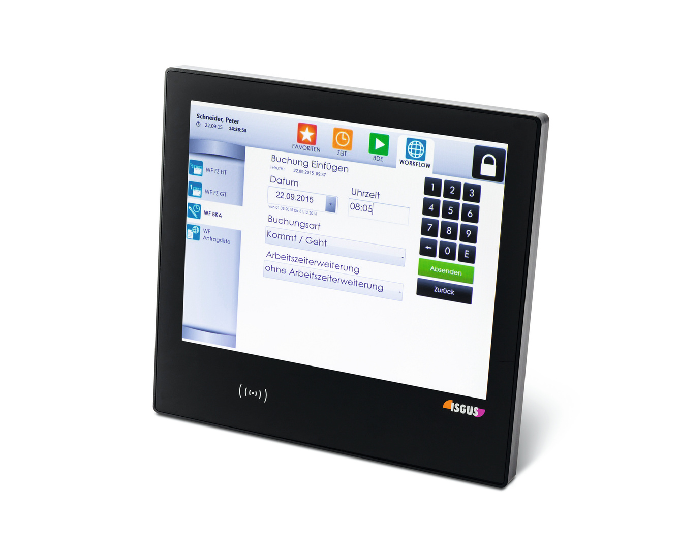 The IT 8250 multifunctional terminal with anti-glare 15” TFT display meets all requirements for time recording and plant data collection. The large buttons and function symbols enable easy and safe use of the touchscreen, even when wearing gloves. Information like orders, workflow and absence can thus be accessed directly at the workstation by staff. Thanks to its low housing depth, the terminal is also deployable in confined spaces.