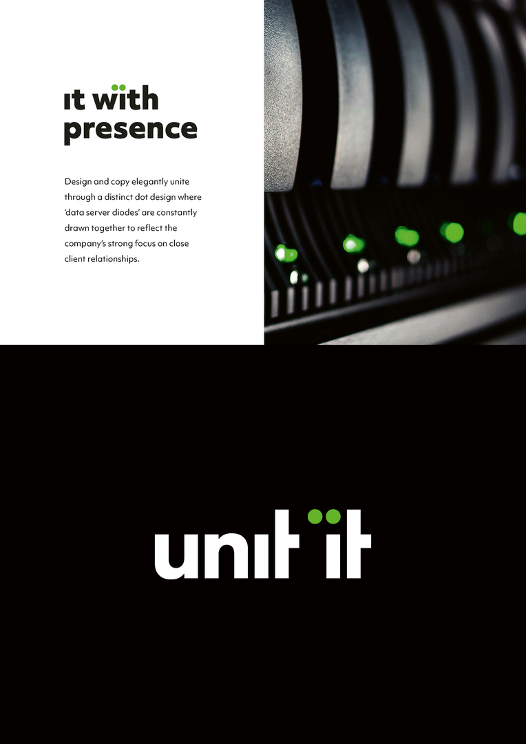 The merger between three IT companies in Denmark made it necessary to create a new, uniform corporate design. Its appearance was supposed to reflect the efficiency of a country-wide IT service provider while, at the same time, building a strong presence on the local market. The feeling of belonging together – internally and externally – is emphasised through the brand name Unit IT with the subtle reference to the word united. As a symbol of strong customer retention, the logo is shaped by two neon-green diodes, which visually underpin the brand promise of the word mark and run throughout the entire visual identity as a recurring element.