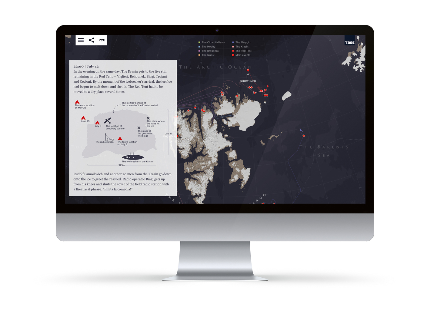This multimedia web special chronicles the Arctic expedition of the airship Italia – commanded by Italian engineer and General Umberto Nobile – that crashed during the return flight from the North Pole in 1928 and also describes its international rescue operation. Using a 3D model of the airship, interactive infographics, maps and 3D-animated scenes to illustrate the story, it details the numerous rescue efforts and puts them all on one map – documenting an outstanding international cooperation for the time. Also, the process of creating this longread featuring a dramatic text filled with all kinds of multimedia elements was no less international.