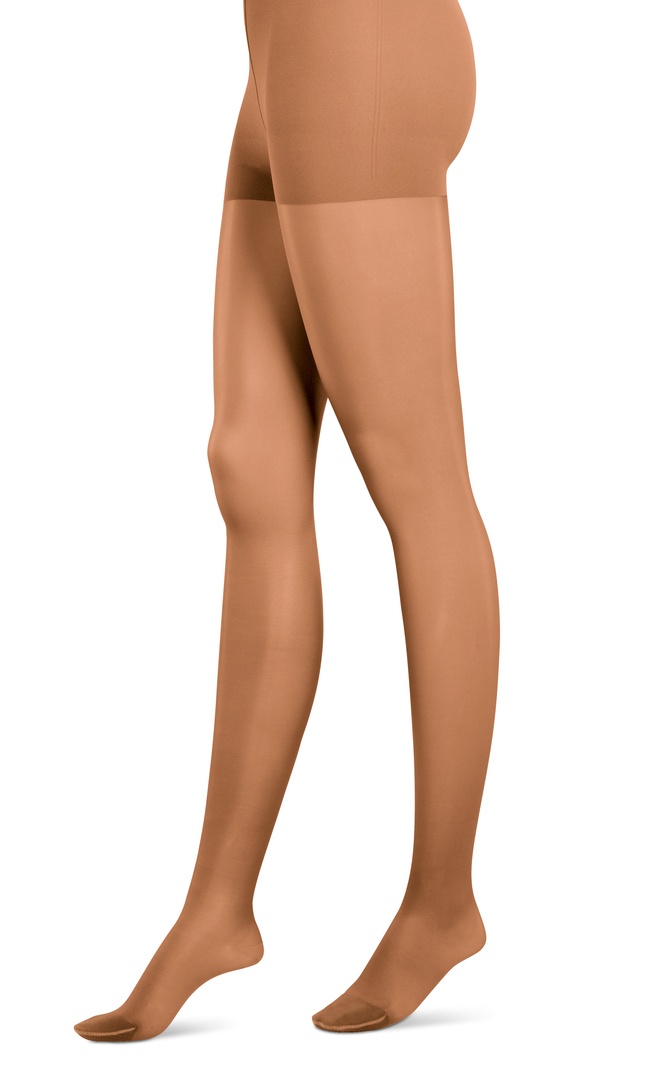 These compression tights are available in a variety of colours to suit different skin tones. Despite their strength, the thickness of the material used visually only corresponds to 15 denier making them barely noticeable when worn. In an effect akin to make-up, they hide little irregularities of the skin, accentuate the slim line of the legs thanks to their shape-defining compression behaviour, and a supporting insert does the same for the bottom.