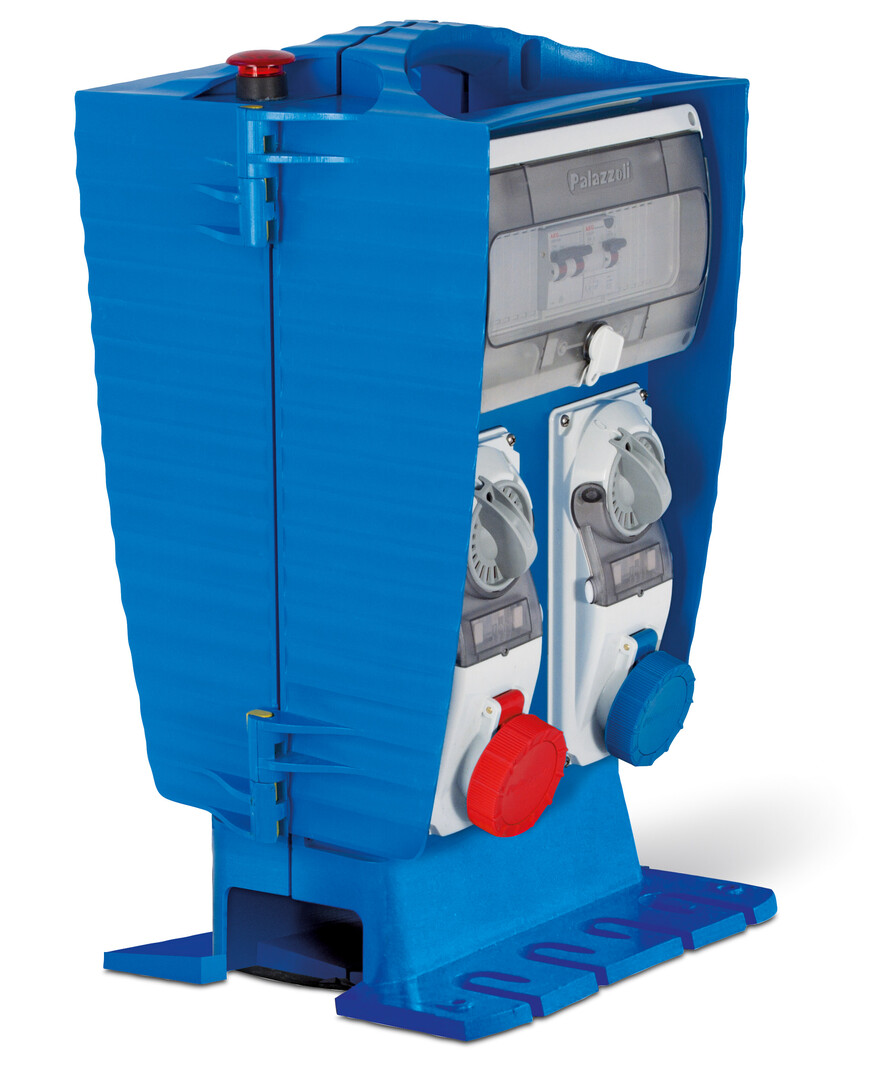 The mobile Janus distribution board was designed for use in challenging building site conditions. It is easy to transport and can either be placed on the ground or attached to the wall folded out. Its design with two front panels is inspired by Janus, the ancient god with two faces. The lower cable holders prevent the cables from accidentally being pulled out and thus interrupting the power supply.