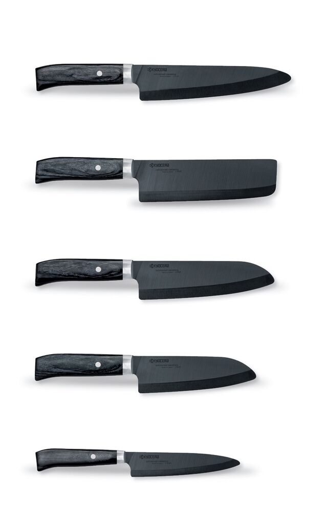 Inspired by traditional craftsmanship, a series of ceramic kitchen knives was developed to reflect the Japanese cultural heritage. The artisanal handle made of dark pakkawood with stainless steel trims is visually and haptically striking. Combined with a black, hand-sharpened ceramic blade, an overall impression is created which is reduced to the essential. The dense and smooth surface of the corrosion-free blade allows for precise cutting while the extreme hardness of the material ensures exceptional edge retention.