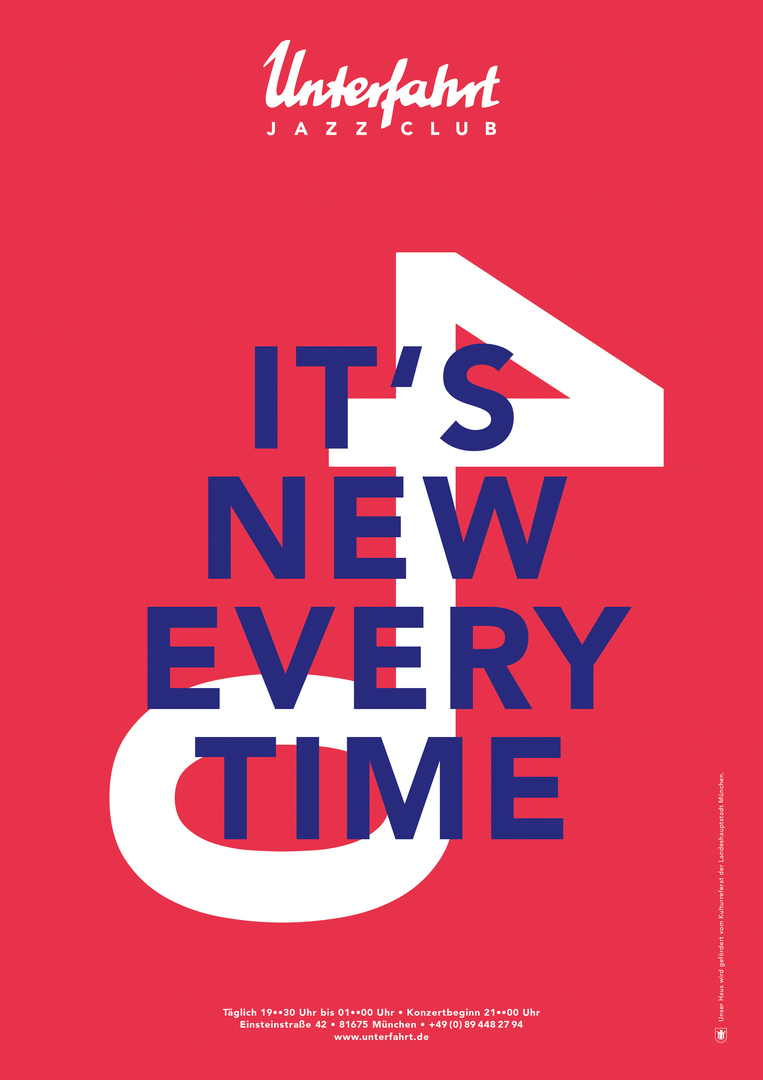 This celebratory symbol was designed for the 40th anniversary of the Jazzclub Unterfahrt in Munich, Germany. In the sense of a symbiosis of the number 40 and a musical note, it conveys the notion of 40 years and the genre of jazz music. Statements on jazz have been developed to overhaul the appearance of the club and lend it a young and fresh outlook. The individual design elements have been configured to reflect the need for rapid provision of information and a high level of brand recognition.