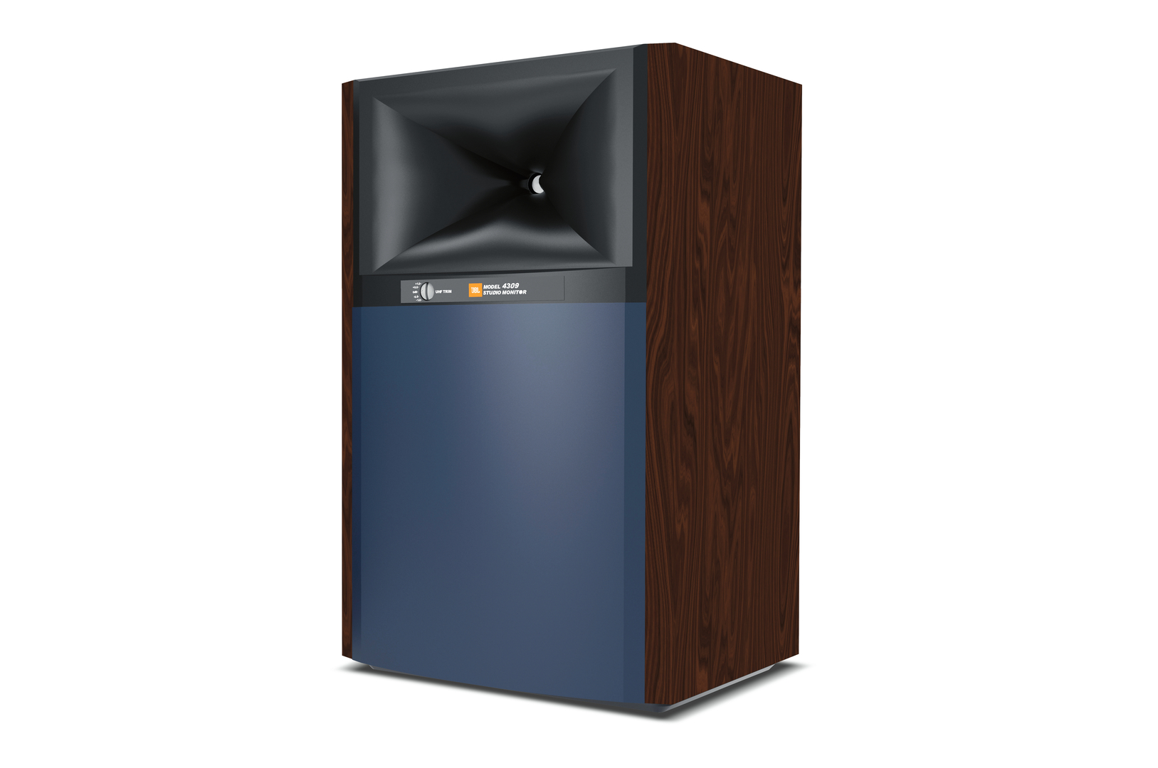 The JBL 4309 Studio Monitor is a small, powerful bookshelf speaker. For detailed sound, the 1-inch compression driver is mated to a horn in advanced HDI geometry. The appearance of the unit harkens back to the JBL professional studio monitor design with the iconic blue baffle and exposed horn. Two finishes are available, including satin Walnut and Black Walnut woodgrain veneer with a matching blue or black grille.