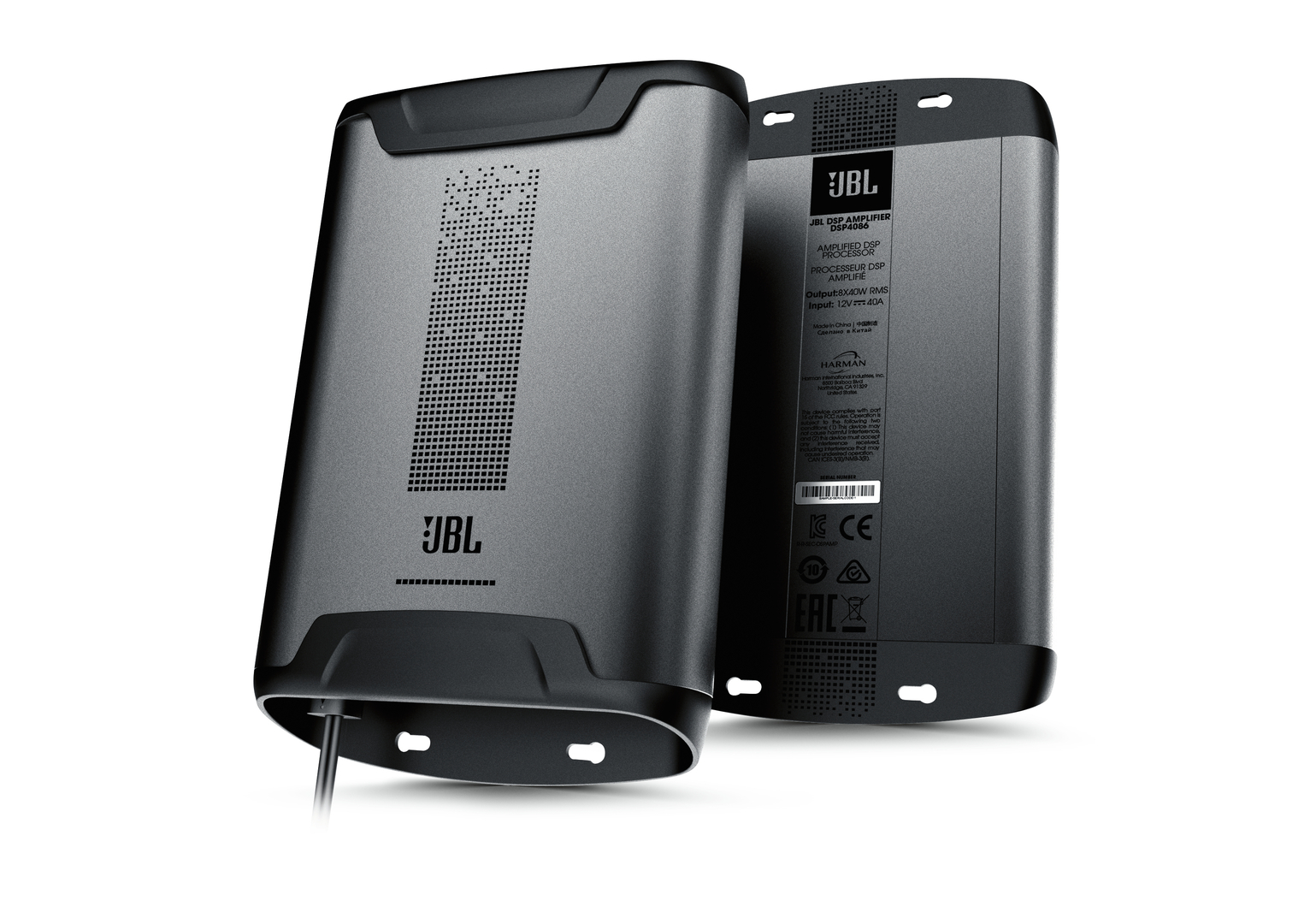 The look of the JBL DSP Amplifier is distinguished by a cool-grey body made of anodised high-tech aluminium, soft curves and angled end caps in black. The pixel graphic on the front symbolises digital music data. The amplifier has a straightforward user interface with plenty of tuning options. A USB port enables access to the tuning interface via a PC, and this makes adjusting the audio system even simpler and more precise.