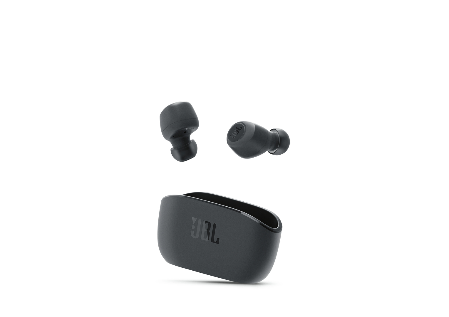 The JBL WAVE 100TWS earbuds sit in an open charging box that picks up and continues their shape with dynamically drawn curves. In this way, the visual unity of all product components is achieved.