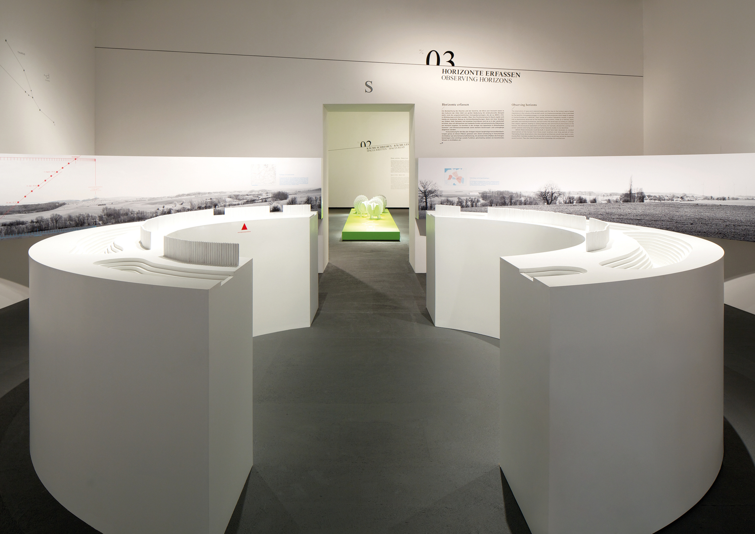 The Pergamon Museum’s temporary exhibition “Jenseits des Horizonts” (Beyond the Horizon) deals with diverse questions about the knowledge of space in antique cultures. Visitors are guided through 16 exhibition spaces with the use of an artificial horizon. The overall design of the exhibition, transported by various communication media, gives way to a rich variety of individually styled exhibition spaces. A central theme of the exhibition deals with the mapping of the world. In this context, original maps are presented in parallel to a 20 metres long, audiovisual large-scale projection of our rotating planet, as it travels through the universe. More than 400 objects present a wide panorama of diverse findings including celestial observations and land surveys, the travels of the gods, rooms for body and soul, curses, oracles and acoustic chambers, drawing visitors into the antique world.