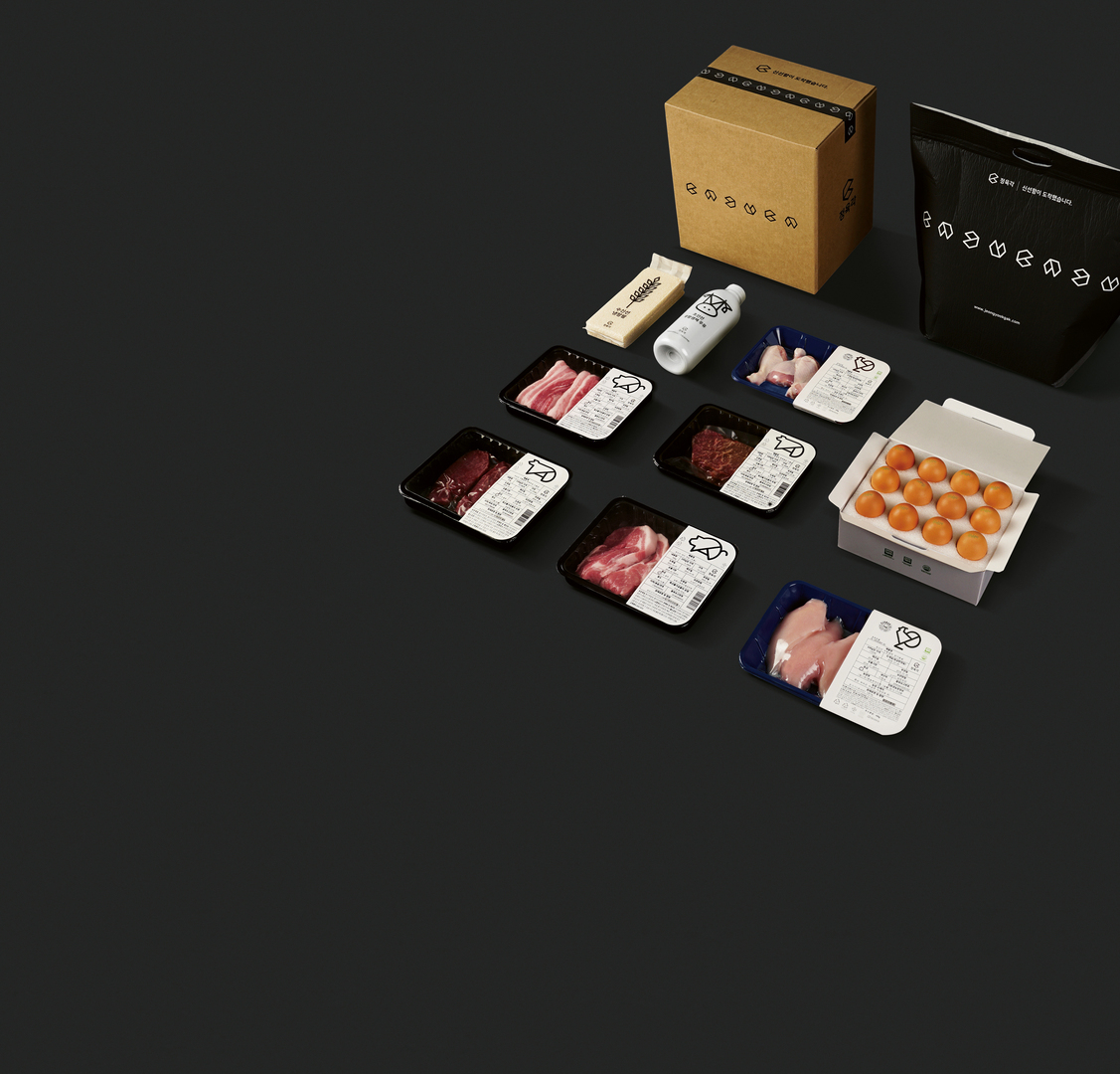 Jeongyookgak, an online service for fresh grocery, has changed the distribution value chain by leveraging IT in the livestock industry. The service implemented an on-demand system to deliver fresh groceries to the consumers just in time. The branding was focused on the aim of setting the brand apart from other competitors in this traditional market environment. Thus, a neutral and contemporary tonality was created for both brand design and marketing, so that consumers would recognise the brand as an extraordinary player in the industry. The black-and-white packag-ing highlights the natural colours of the food.