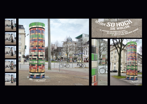 The casino Spielbank Hamburg was one of the hosts of the satellite tournaments of the 18th German poker championships 2010 in Texas Hold’em No Limit – a poker variety with no stake limit. Prior to the tournament two premium city-light columns were converted into coloured metre-high chip towers. Visible to car drivers and passers-by from far and in conjunction with the message, “Bet, as high as you wish!”, they attracted numerous participants and visitors.