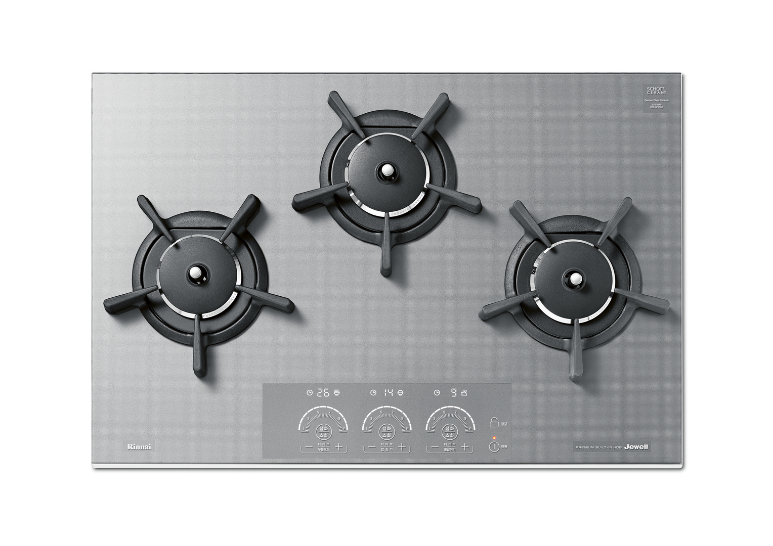 The Jewell Premium gas hob is characterised by its 750 mm wide glass surface, an intuitive operating panel with semi-circular graphics (“touch-wheel”) and cast-iron pan supports. It also integrates intelligent functions such as a timer and a water and rice cooking mode for each burner. Gleaming white LEDs are built into the toned-down silver glass base plate, emphasizing its elegant appearance. A dot-patterned graphic extends over the whole surface.