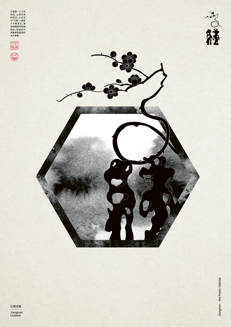 This series of posters pays homage to the beauty and diversity of the scenery in the Jiangnan region in China. The ink drawings show motifs from the Jiangnan gardens. Typical plants such as bamboo and the plum blossom as well as the formations of the well-known Taihu Lake stone make up the logo of the region, turning them into ambassadors for Jiangnan. The geometrically shaped frames around the motifs are a well-executed detail which act like a window through which the visitor can catch a glimpse of the gardens in Jiangnan.