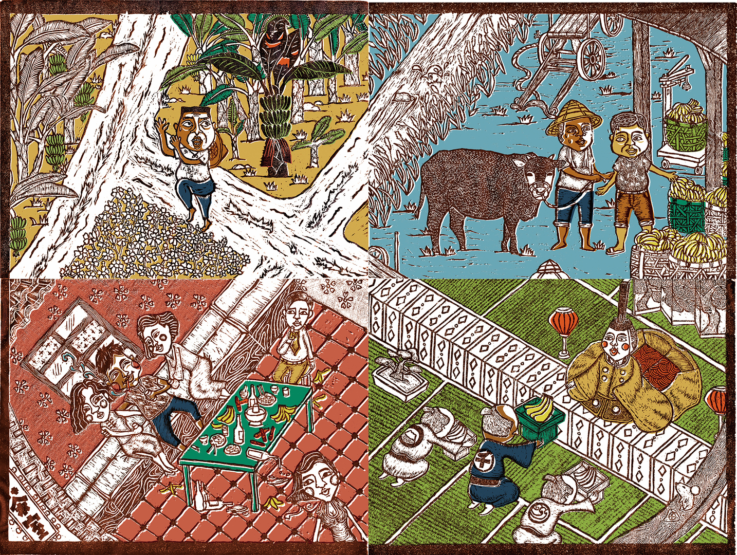 This illustration work visualises the historical features of the mountain banana industry in the township of Jiji in Nantou County, Taiwan, during the Japanese occupation with the aim of promoting this branch of industry and help revive the local industry today. For these purposes, it narrates four different tales of the abundant treasure of folk anecdotes related to the mountain bananas of Jiji, which have been transformed into skilfully designed illustrations. The individual tales, for example that the bananas approved by Japanese emperors were marked with the Chinese character for “thousand” which represented a seal of top quality for mountain bananas at that time, were realised using a wood printing technique by laboriously carving them with knives into woodblocks, an approach that symbolises humble yet steady progress. The four prints present the four tales separately but, when the illustrations are combined, they connect to form a mark that corresponds to the Chinese character for “thousand”, symbolising the highest quality.