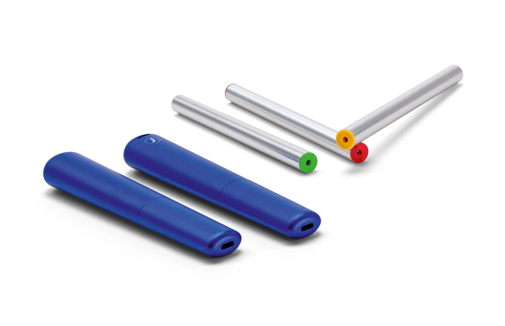 This vaporiser consists of a body of anodised aluminium and exchangeable capsules, which are available in various flavours. To change the recyclable capsules the device is taken apart by means of an easily used magnet fastener and closed again. Material and form of the outer cover provide a pleasant haptic and a modern style. The flavourings contain no nicotine but instead alternative stimulants such as matcha or caffeine.