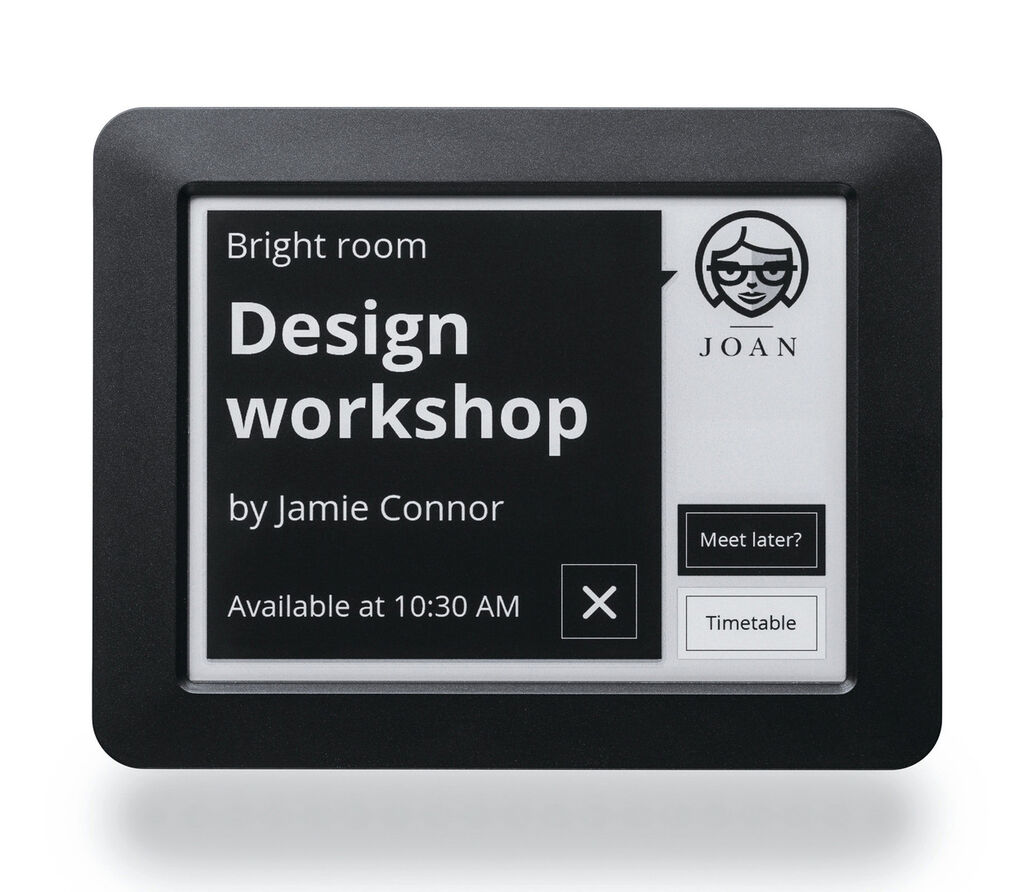 Joan Meeting Room Assistant is a digital door sign and conference room scheduling solution. It was developed specifically for identifying and managing meeting rooms. It is compatible with all standard office calendars, including Microsoft Exchange and Office 365, Google Apps and iCal. Joan connects itself to available Wi-Fi networks, is quick to install, requires no cables and uses little electricity. The system has no buttons, only an E Ink touchscreen and stays autonomous up to three months.