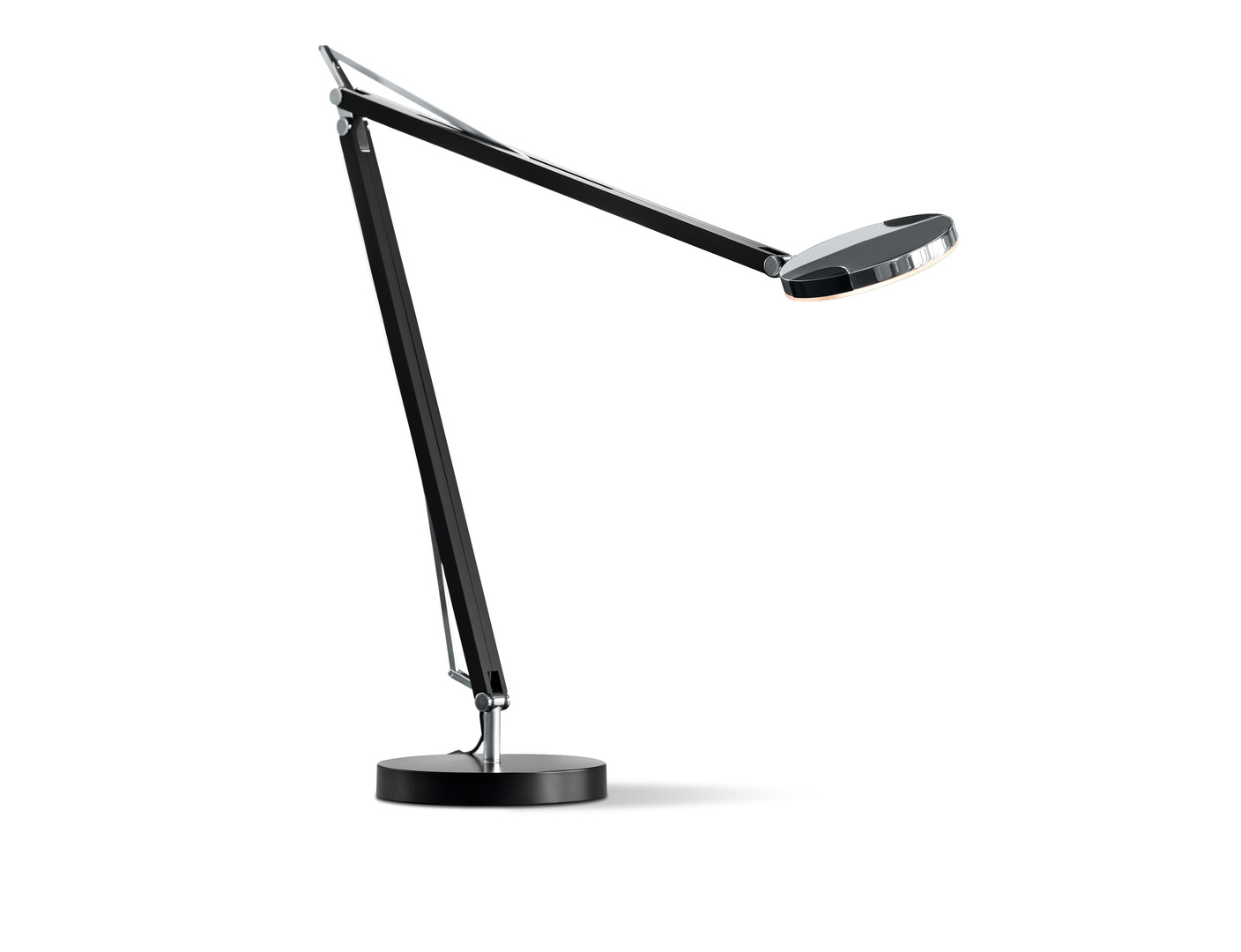 The John desk lamp is an easily movable, jointed-arm lamp. In the flat head a brilliantly shining, high-powered LED is integrated which is glare-suppressed by means of an optical lens. Two dimmers are located opposite each other in the lamp head. John is available in two versions: polished aluminium with high-gloss, white or black plastic components as well as in light colours at 2700 Kelvin (warm white) and 3500 Kelvin (white).