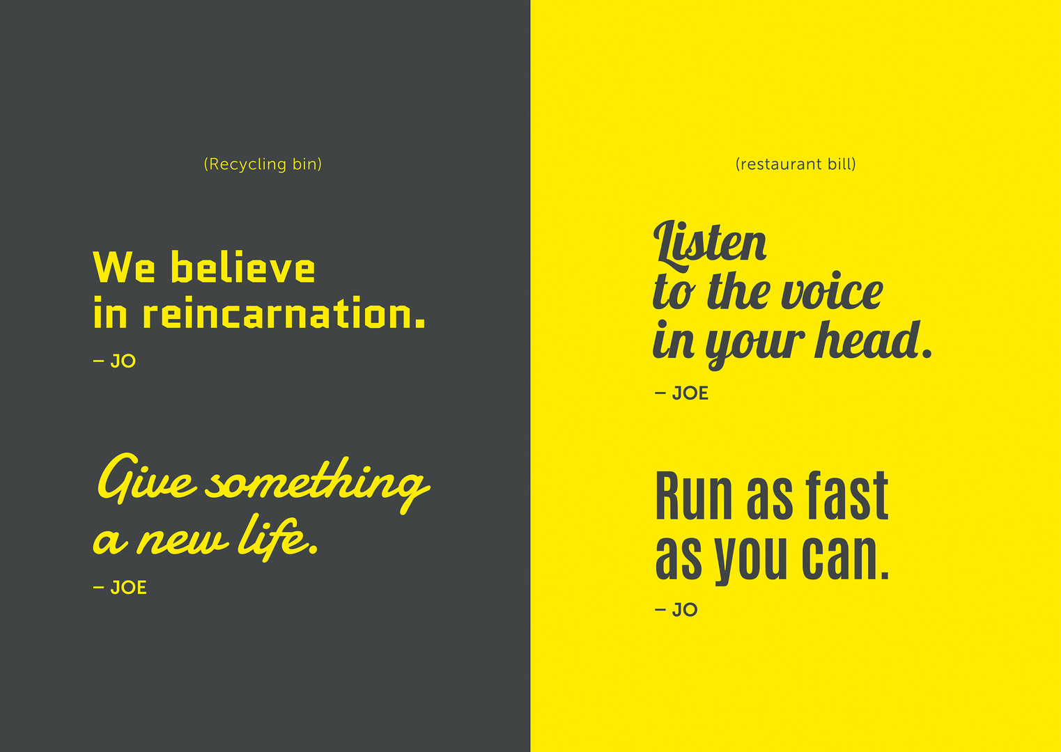 The brand JO&JOE reconnects hospitality with the complex and eclectic target group of millennials, who tend to associate hotels with boredom. To cater to this wide population, AccorHotels invented a new breed of hospitality: JO&JOE, a hybrid place in between a bar, restaurant, hostel, apartment and concert hall. It is a brand with a schizophrenic personality, two ways of seeing the world, of travelling, of partying. Its refreshing and versatile visual identity adapts to each city, and its graphic territory is fuelled with witty catchphrases and pictograms.