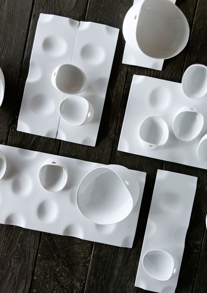 Jo¯mon is a set of bowls and trays made of porcelain and glass. Inspired by the origins of culinary art, a nature-related formal language characterises this tableware for Asian and international dishes. The handy trays with relief-like hollows provide a multi-purpose space for the larger bowls as well as the smaller dip bowls.