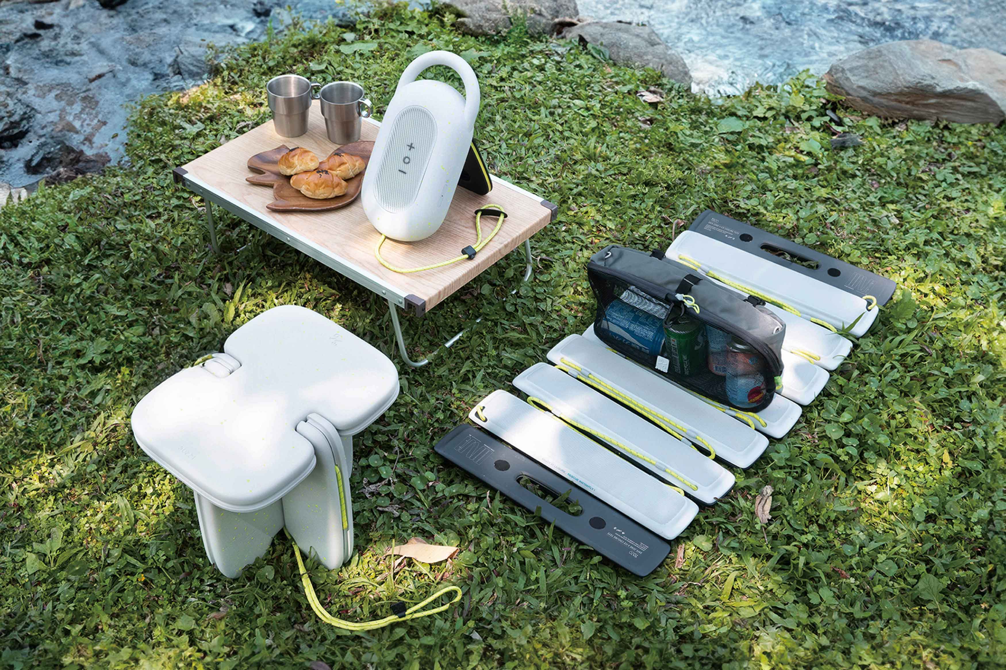 Jozzi ensures safety by the stream with multifunctional outdoor gears made from recycled EVA material. A portable stool converts into a 150cm rescue and flotation device, and a cooler bag creates a safe zone of up to 8 metres to prevent accidents. The waterproof speaker also doubles as a flotation aid. Each product can be easily accessed and quickly transformed into an effective rescue tool. Red Dot Award: Design Concept | Red Dot: Next Gen Award | Concept | Outdoor and Camping Equipment