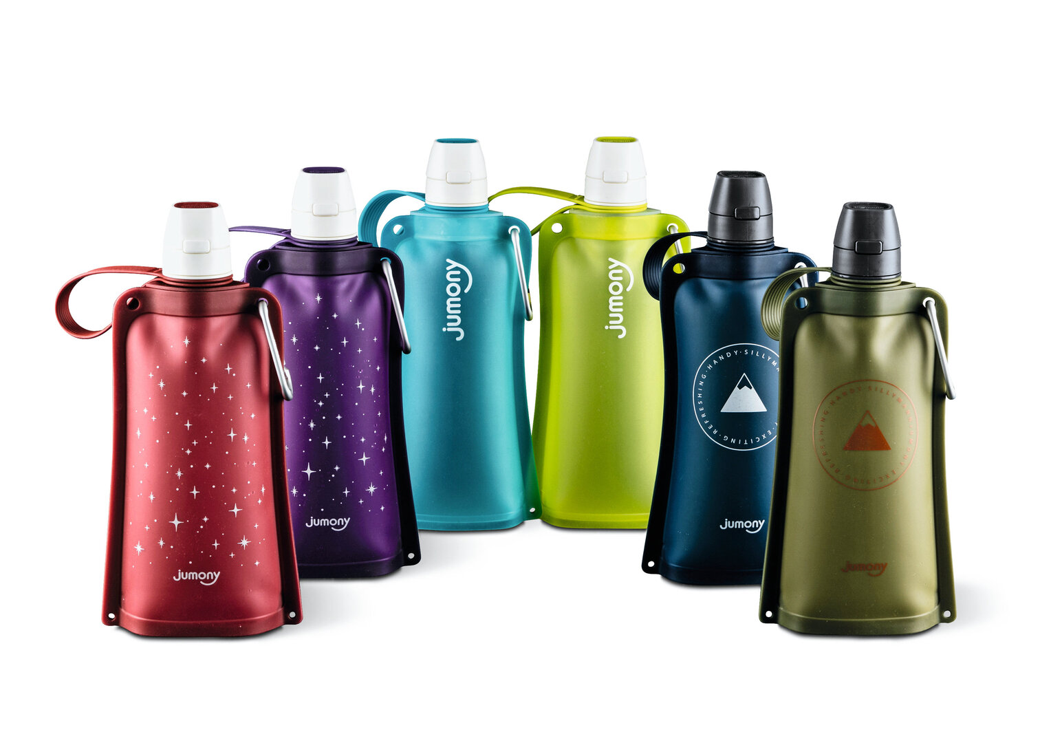 Jumony is a trend-oriented and practical drinking bottle. It is made of particularly high-grade silicon that is flexible, can be rolled up and is extremely resistant to heat and cold. The 550 ml bottles are available in eight colours and three concepts: Casual (easy), City Life (urban) and Outdoor (wild). The smart cap features a double-valve structure to prevent leakage. A ring on the drinking pouch allows users to attach the bottle to clothes or a bag. The selected platinum silicon is free from toxic substances and can be sterilised with boiling water to keep it clean.
