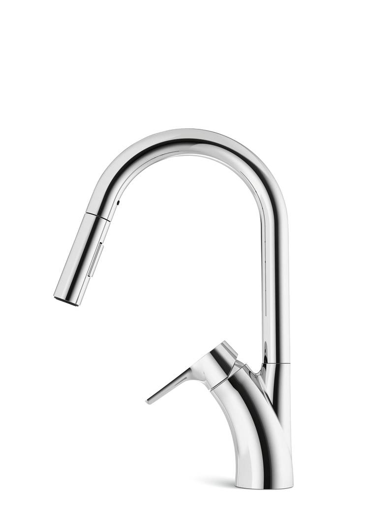 The design language of this kitchen faucet was inspired by the body movements of tai chi and the yin-and-yang concept. The pull-out kitchen faucet implements these approaches with modern and minimalist lines. The extraordinary appearance is formed by the combination of a curved spout with a lever that is dynamically inclined towards the user. The 360-degree movable spout with two different spray types is also convincing in terms of use.