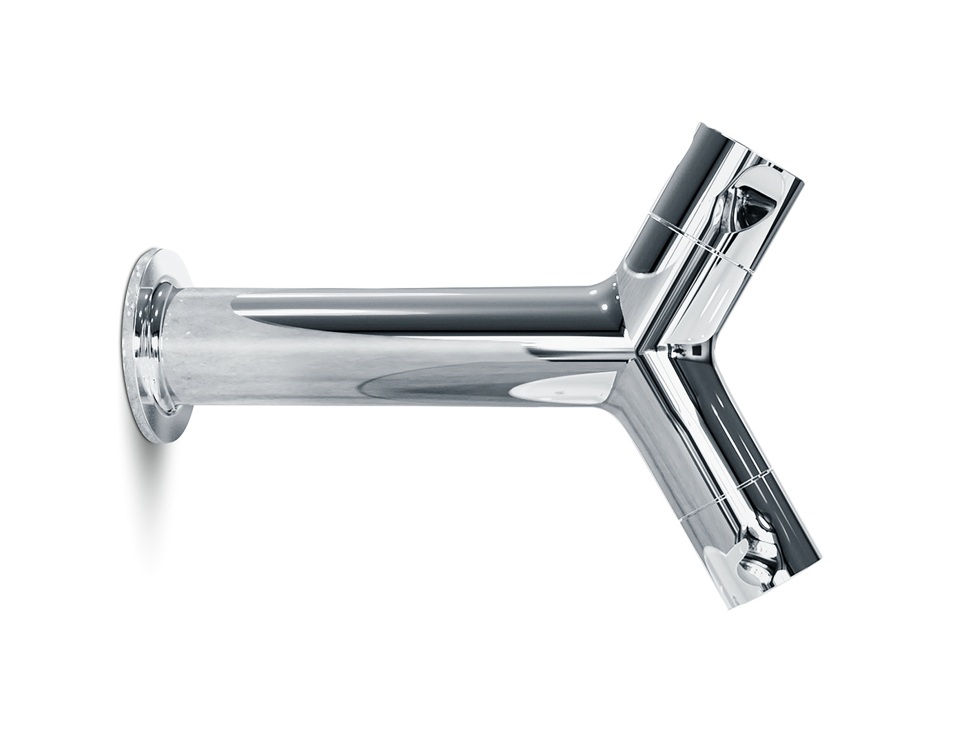 The eye-catching feature of the Yes 2 basin mixer is its Y-shaped design. At the water outlet, the cylindrical body merges into two regulators diverging in opposite directions. Their handles contain small hollows that provide for convenient operation. Flow rate and temperature are controlled separately: The lower handle is used to start the water flow and regulate the flow rate, while the upward-pointing counterpart adjusts the hot and cold water settings.