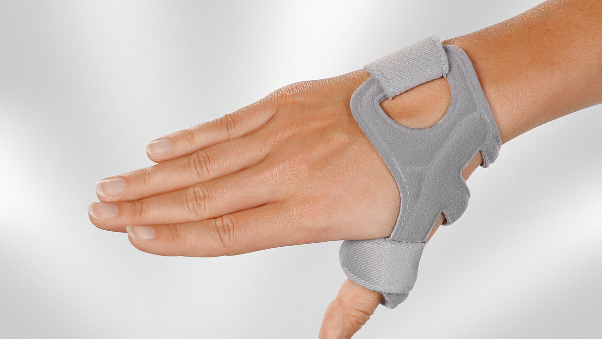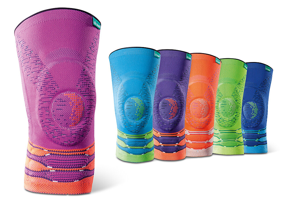 Thanks to its loud colours, this knitted knee support with its high-quality textile craftsmanship looks less like a therapeutic aid and more like a fashionable accessory.