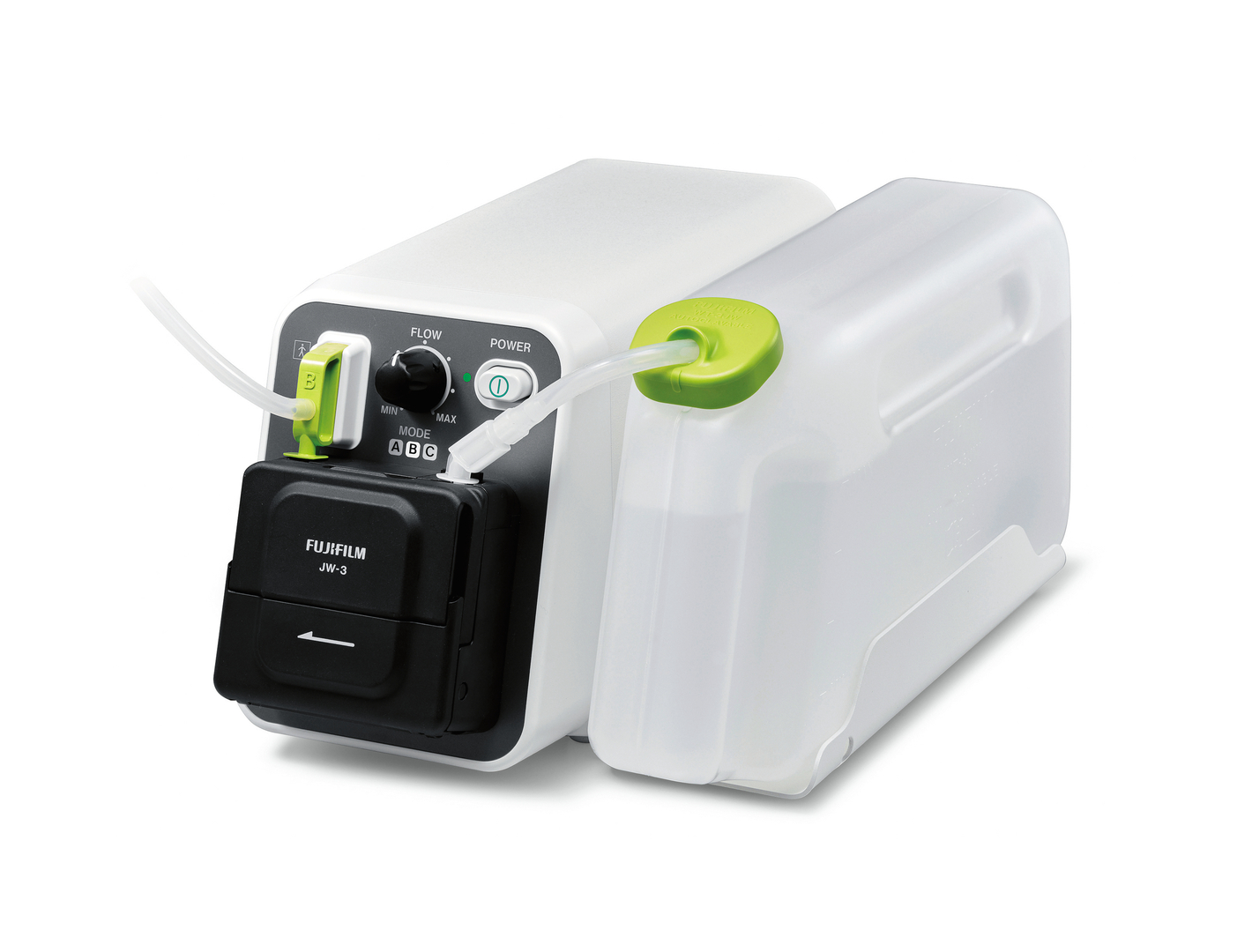 The JW-3 water pump connects to endoscopes and high-frequency knives to clean the lesions with water during an invasive medical procedure. Various tubes are available for the different applications, and the connector for each tube is recognised by the unit automatically. The connectors are clearly highlighted in green. The main unit and the water tank form a compact visual unit but are designed as separate entities, so that the tank can be conveniently removed for filling.