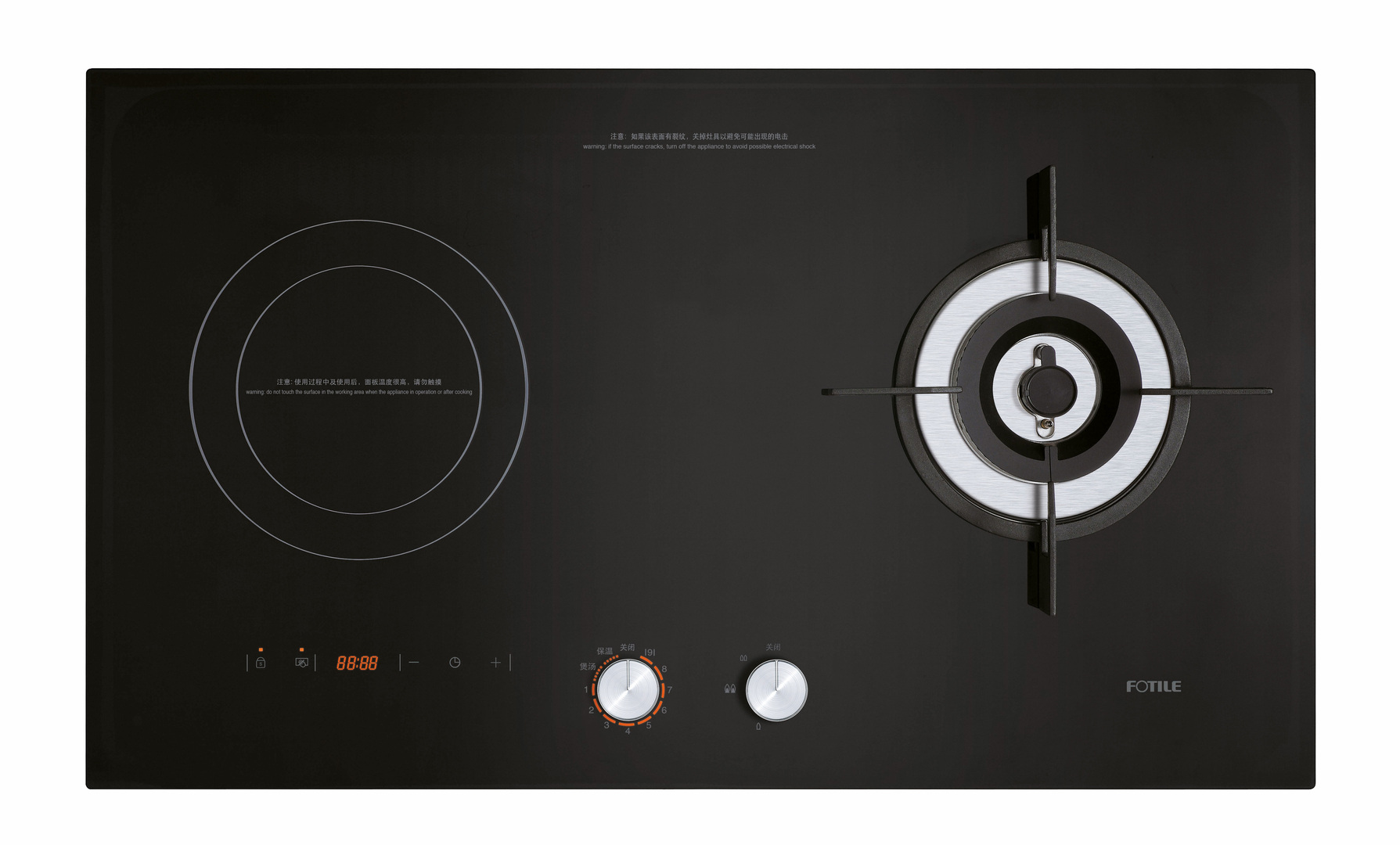 This hob, with its microcrystalline glass surface, unites the advantages of a gas cooker with those of an induction cooker. The designers were inspired by the display of a dashboard and created a minimalist-looking panel with two rotary knobs. Users can adjust the cooking heat in twelve levels and the respective heating level is displayed by means of orange LED symbols.