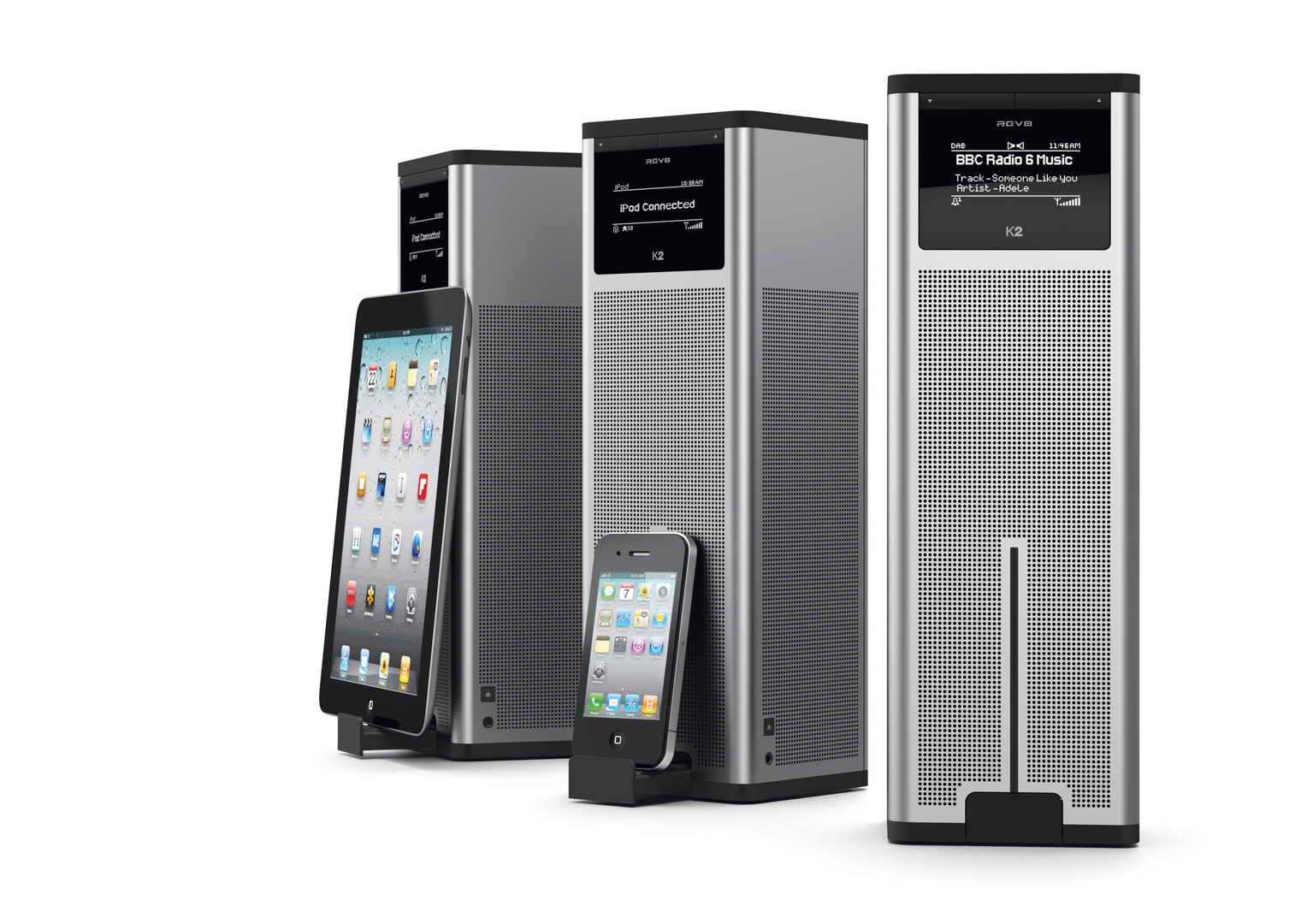 The K2 digital radio supports radio standards such as DAB, DAB+, FM and Wi-Fi Internet radio. It allows for wireless audio streaming from a PC or Mac and may also be used as docking station for Apple devices like the iPod, iPhone or iPad. The radio has the shape of a towering column and is made of anodised aluminium and moulded rubber parts. It includes a graphic OLED display and various connection options.