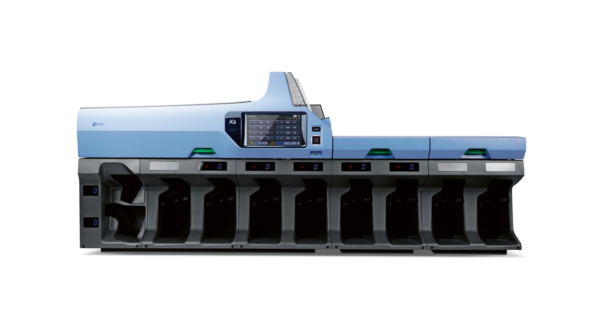 The banknote sorter K6 was developed to process large volumes of banknotes. The output trays have a wide opening that facilitates access to stacked bundles of banknotes. The two rejection trays are integrated at the front, creating a single row with the output trays so that rejected banknotes can be sorted out immediately by the user. In addition, the linear arrangement offers a slim and simple design and makes it easier to access the machine, both during operation and for maintenance purposes. Thanks to its modular construction, additional trays may be added.