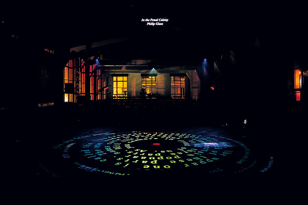 Kafka’s short story “In the Penal Colony” is a tale about an ominous machine which tortures and kills prisoners according to the rules of a gruesome legal system. An artistically designed font is the key concept for the depiction of the machine on stage. Different text passages were rearranged into a projected circular grid. On stage, this “font swarm” encircles the actors, creeps towards them and ultimately covers them completely. The typography strikingly embodies the feeling of an overly powerful, impalpable threat, which is inherent in the play.