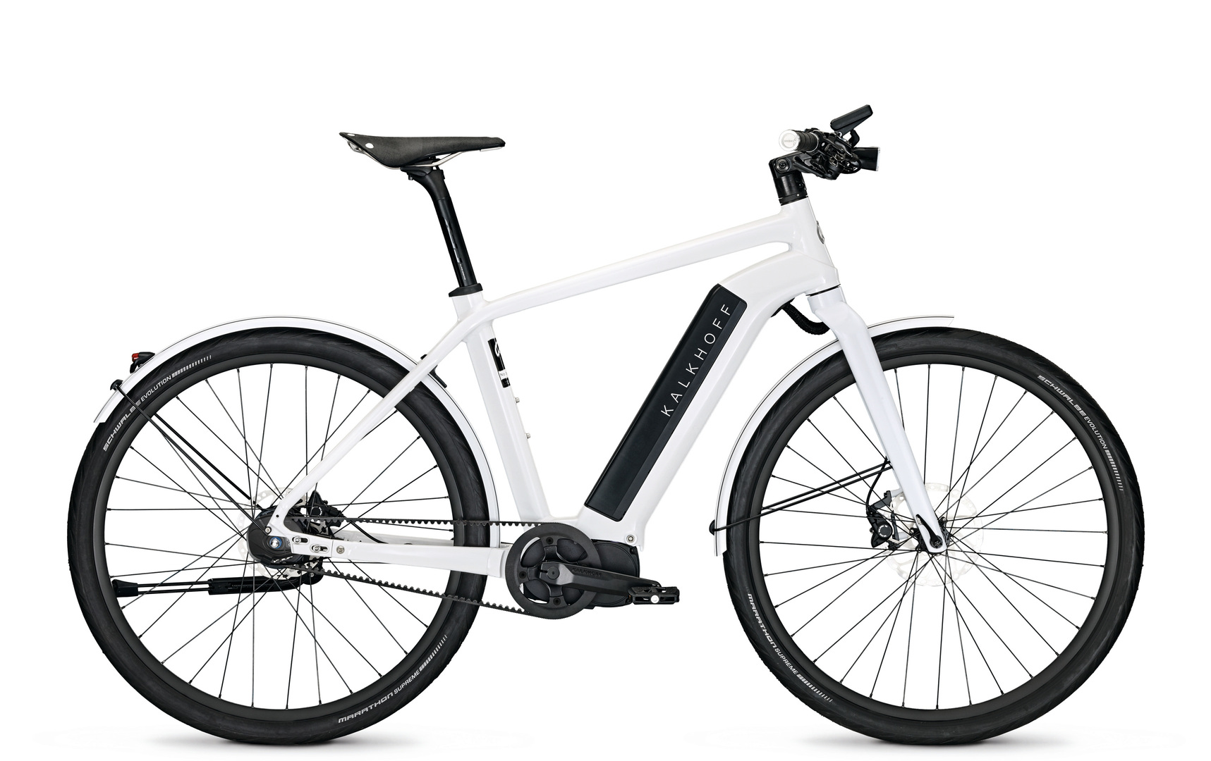 The Kalkhoff Integrale LTD White sets new standards with its quiet yet powerful motor as well as a fully integrated battery and outstanding handling. The white special edition model is characterised by a purist design and benefits from the performance of the redeveloped Impulse Evo RS drive system with its quiet, powerful torque of 80 Nm. The high-performance 17 Ah batteries are seamlessly integrated into the extremely strong down tube. The e-bike is controlled intuitively via the Impulse Evo Smart Display and connects easily via Bluetooth for navigation. With its maintenance-free hub gears and a carbon belt drive, this limited edition e-bike of only 500 units, recognisable by its brushed-aluminium badge, stands out through its design and features.