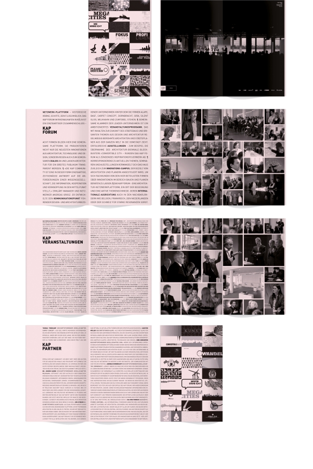 This large-sized image brochure introduces the responsibilities and activities of the KAP Forum for architecture, technology and design. The basis of the documentation is a selection of hosted events, lecturers, invitation cards, representative photos of theme nights and information on partner companies. The brochure features a single-colour black print on thin, pink newsprint paper; its design is generous and powerful, expressing the dynamics and diversity of the forum.