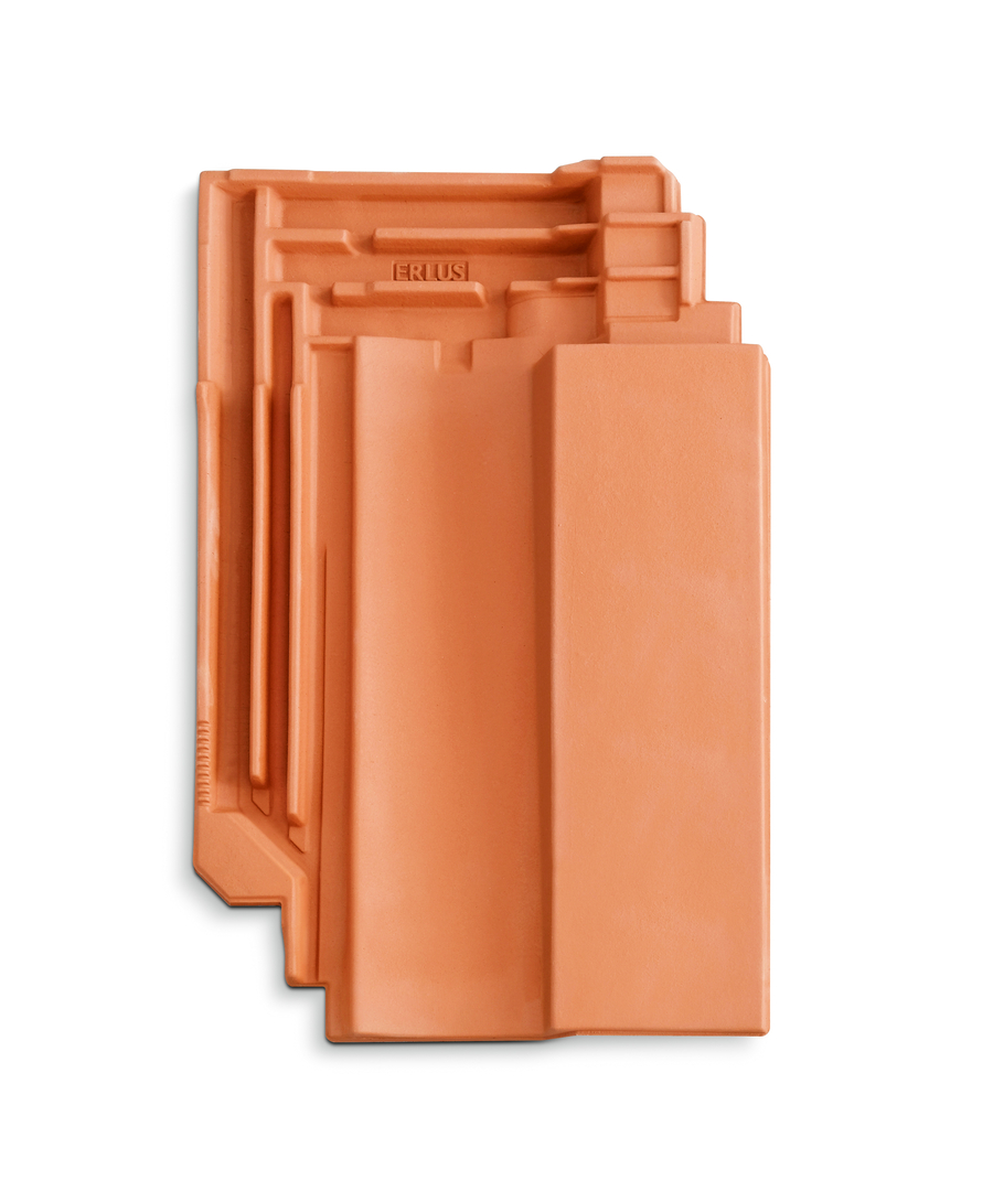 It is almost a little surprising that there are still product innovations that manage without new materials, smart functions or the latest technologies – and which yet are new, different and trendsetting for their industry. One example of this is Karat RS, a clay roof tile whose history goes back to 1966. Back then, it caused a sensation as the first roof tile model that also works on a roof pitch of just seven degrees. The tile became a classic and remained successful on the market in unchanged form for more than 50 years. Ten years after Erlus began to gradually modernise its product range in collaboration with the “speziell” design studio, the company also ventured into the further development of the Karat tile, the manufacturer’s premium product, which was to benefit from all previous findings. In an evolutionary innovation process, the essential characteristics of the classic tile were worked out, all design and formal details were analysed, contemporary functions were added and brand-typical features were made visible. The linear, sleek design language is now reflected in all functional elements. However, the tile is truly innovative above all in terms of its functionality: With a view to future extreme weather conditions, it has been given a deep, all-round triple fold to keep driving rain away from the sub-roof even at a roof pitch of seven degrees. The distinctively folded 4-tile corner offers a high level of storm resistance while a new, elegantly integrated hold-down system with hooks additionally increases wind suction resistance. Improved ribbing on the underside makes the tile hail-resistant up to a grain size of 4 cm and safe to walk on. To optimise handling during laying, stacking locks have also been added to securely anchor the tile packs. The tile itself is still made of clay. “The degree of innovation of this roof tile was achieved through the design alone,” said the jury. “Karat RS impresses with its attention to detail and the sophistication with which a classic has been sensitively yet fundamentally reworked. This roof tile is a sophisticated product that shows how much experience has gone into the material and mould construction. The end product is of impressive quality – both functionally and aesthetically – and in a convincingly way combines tradition and innovation.”