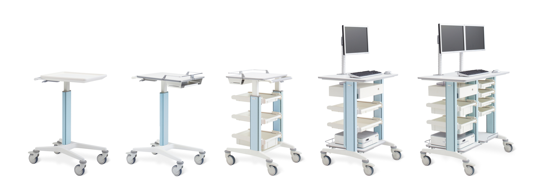 The Karre medical cart series features a surface for notebooks as well as a clamp for heavy monitors. The carts are connected to the mains using the wiring duct underneath the adjustable desktop. Storage trays, shelves and pockets can be arranged as required; a special mechanism prevents the trays and shelves from falling out during impact. The cart reduces vibrations and features a bumper. Its lightweight construction and large castors ensure whisper-quiet motion.