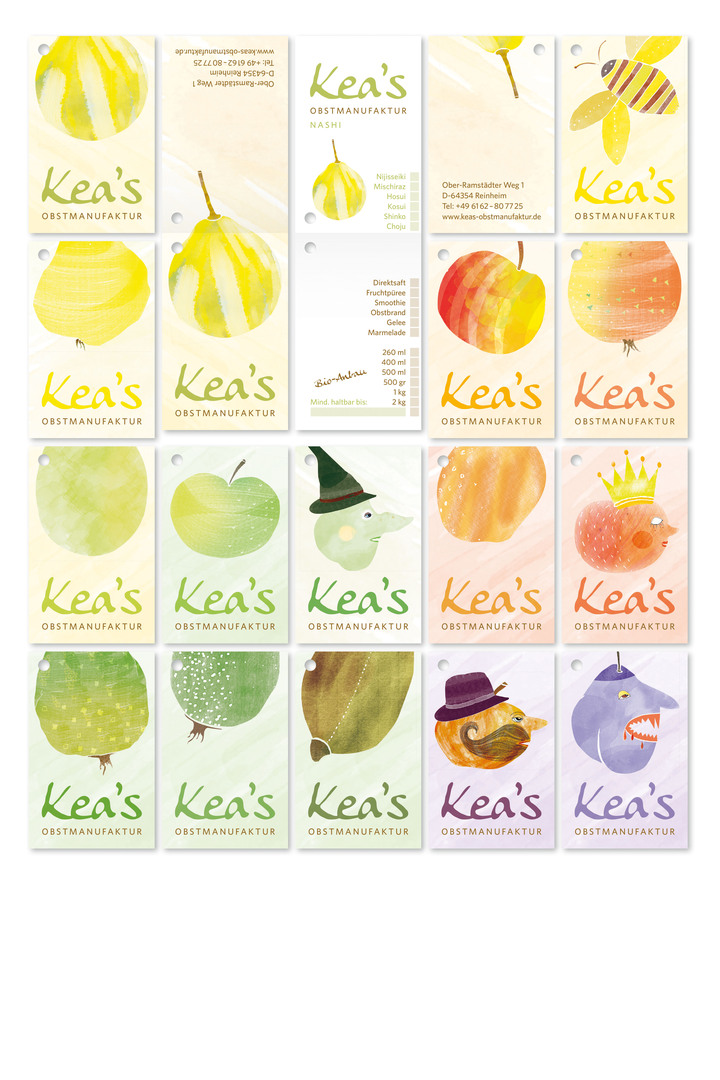 This label system tags the organic products of a family-operated fruit manufactory sold directly from the farm. Nineteen folding labels were produced in a sustainable printing process. The front of each label features the company logo and an illustration of the fruit, while the inside shows the fruit name, little boxes to tick off the respective processing and volume, and one box for the best-before date. This way, 135 different fruit products require only 19 labels, with each label indicating the wide range of the product portfolio. Vibrant watercolours whet the appetite for juicy fruit.