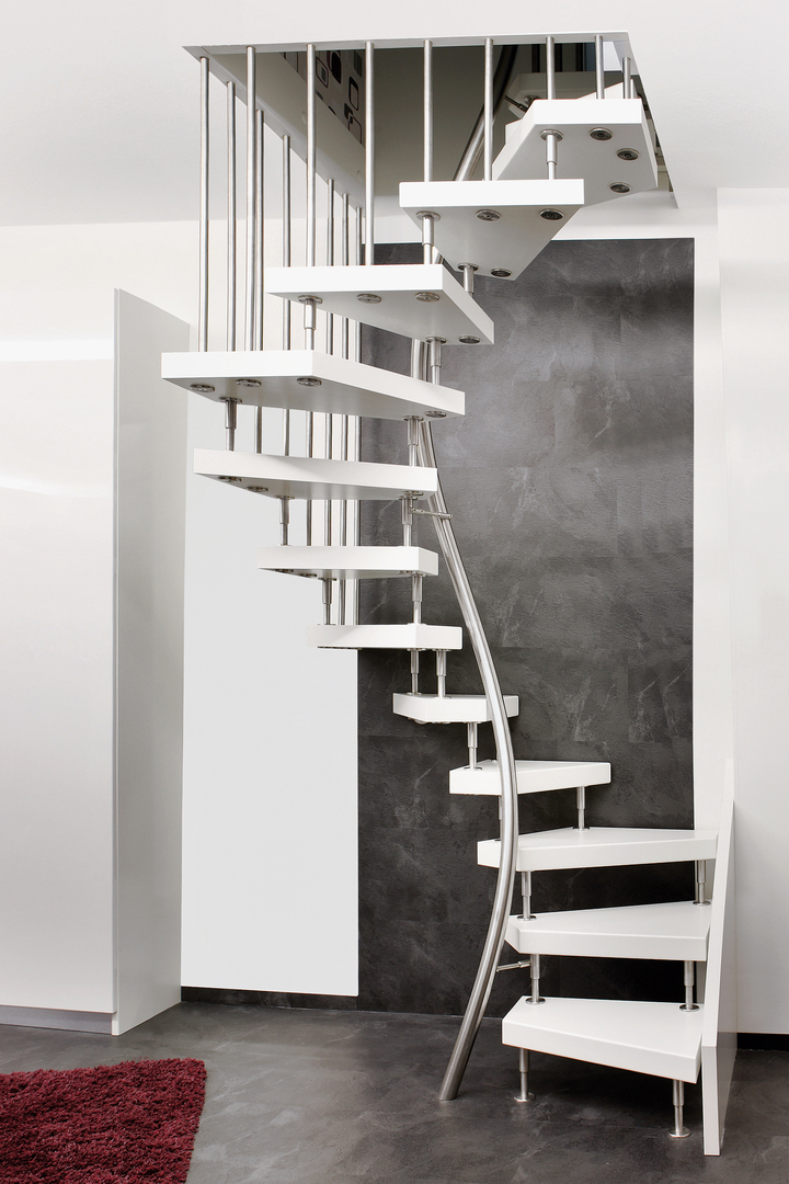 Who has not heard of the space saving-, samba- or retractable stairs? They are a compromise between accessibility and convenience. To date, stairs used to access nearby rooms such as lofts or mezzanines have been neither very comfortable nor safe. Despite the small amount of floor space of one square metre they take up, the space-saving stairs from Kenngott are exceptionally comfortable to use. Their most noticeable feature is the spiral-shaped, stainless steel central handrail. The treads come in a wide choice of materials.