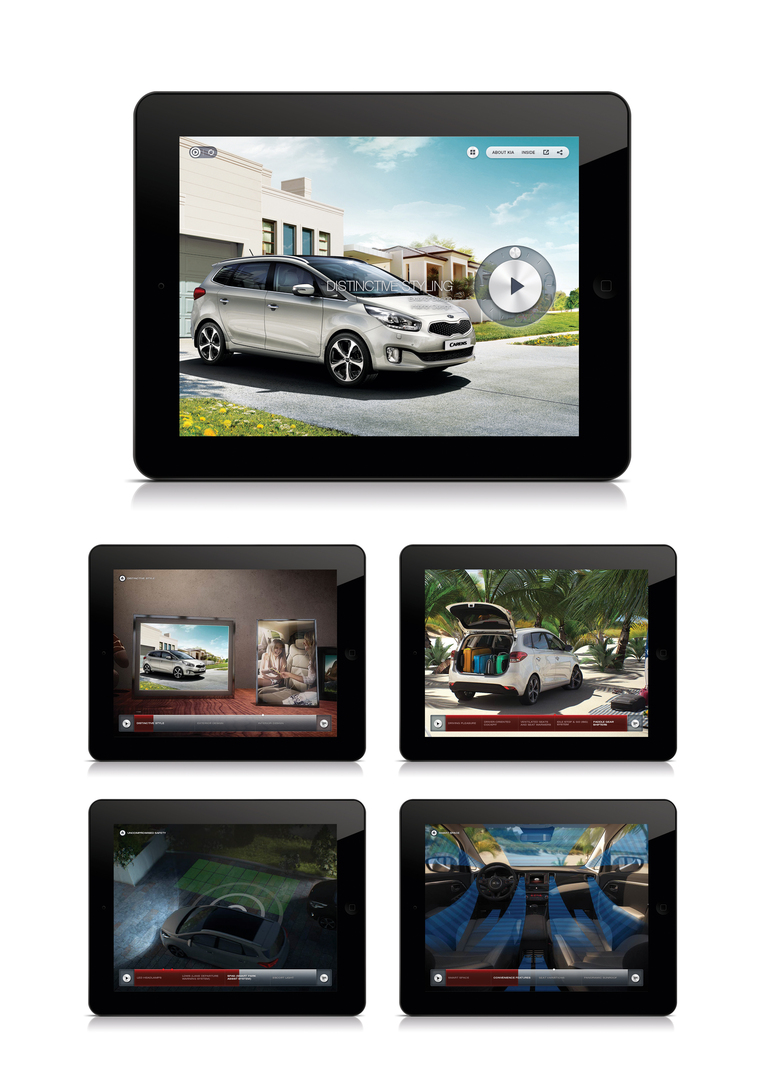 This app allows users to experience the MPV car, Kia Carens. The car is presented in four interactive videos, which focus on the aspects of design, performance, space and safety. Through a clear and intuitive user interface with central dial, these clips highlight the main features of the car. Furthermore, users can experience not only exterior and interior of the car in interactive 720-degree view, but also various customisation options.