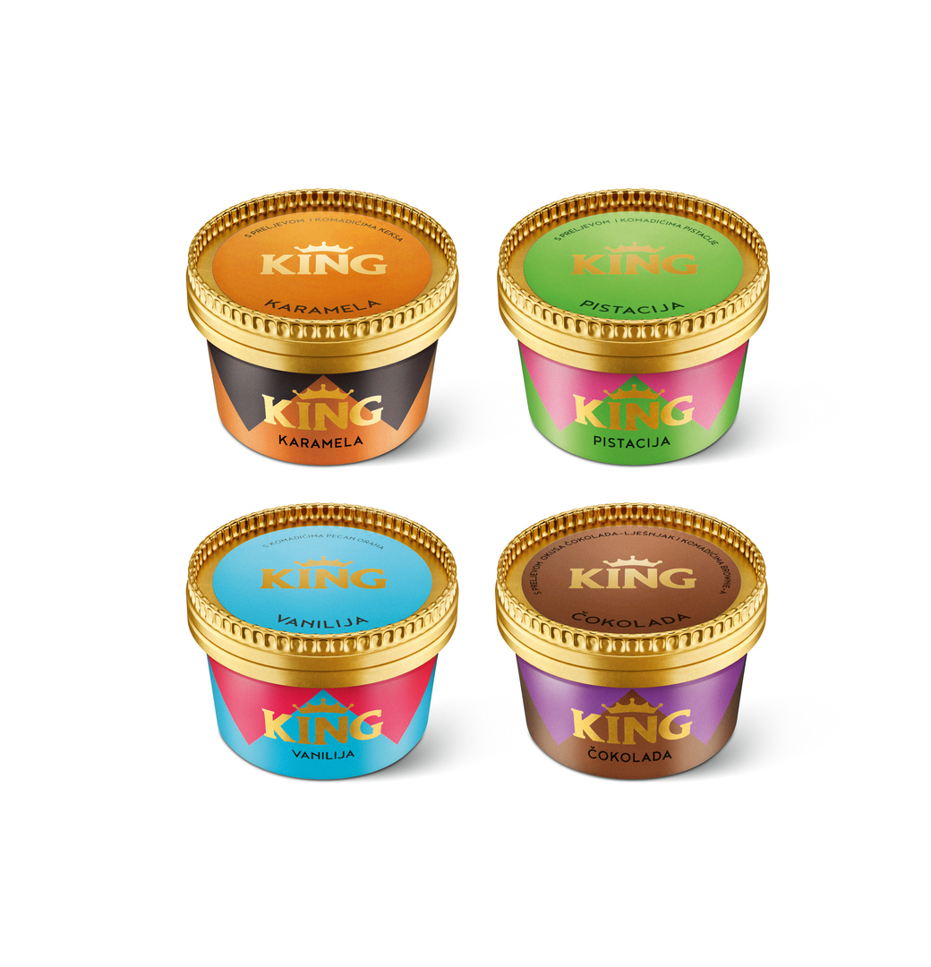 The King brand has been sold on the South East European market as an ice cream bar for many years. Now it is also available as an ice cream dessert in a cup which comes in four different flavours: pistachio, caramel, vanilla and chocolate. The brand is no longer restricted to retail; it is now also offered for sale as a Horeca product. The packaging features a noticeable, playful yet modern design. A stylised shape of a crown is placed underneath the name “King”. This expresses that consuming the ice cream turns the moment into a “regal experience”.