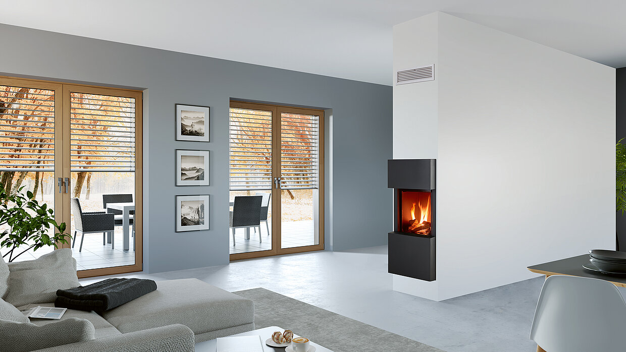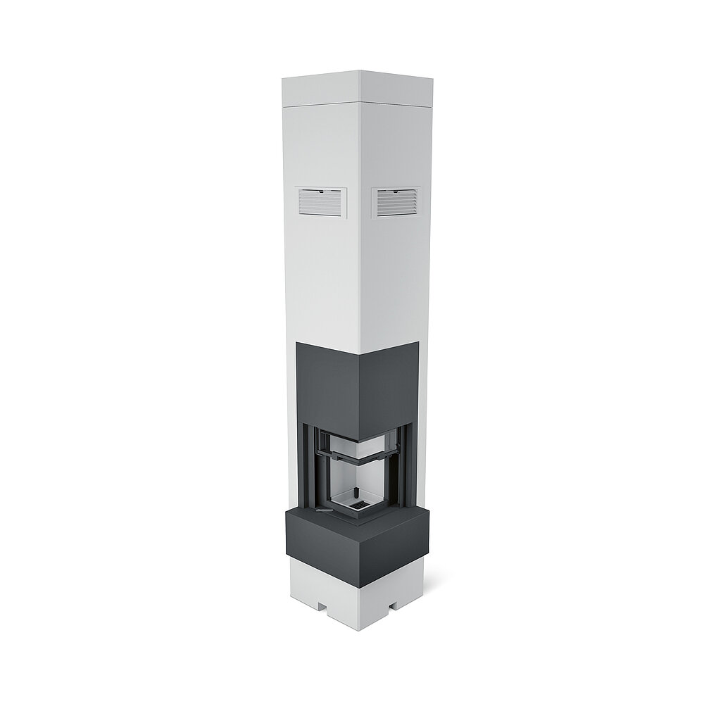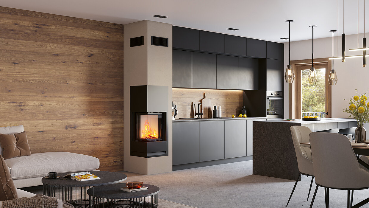 Fireplaces provide comfortable warmth and are popular above all because of the cosy atmosphere they create. However, wood-burning stoves are also criticised for their high level of fine particulate emissions, which is why more and more people are opting for low-emission system technology. KINGFIRE KANTO SC is an innovative stove system that consists of stove and chimney and is already placed in the designated place with a crane during the shell construction phase of a house. Throughout the development process, the focus was on creating an environmentally friendly stove with low energy consumption. Accordingly, this stove system integrates high-tech emission reduction measures such as a fine dust particle separator and a catalytic converter and thereby reduces carbon monoxide and fine particulate emissions by up to 90 per cent. The combustion air is elegantly supplied from the outside through the ABSOLUT supply and exhaust chimney, which is fitted directly onto the stove module to ensure safe operation with a domestic ventilation system. Moreover, an automated combustion control system increases efficiency and ease of use by helping to prevent operational errors. In addition, the material for the combustion chamber lining has been chosen to make the temperature in the combustion chamber rise rapidly already in the start-up phase, which leads more quickly to optimal and thus cleaner combustion and further increased energy efficiency. The jury liked the concept: “This stove solution brings a clear innovative boost to the not entirely unproblematic topic of ‘stoves’. The well-thought-out airflow ensures greater energy efficiency and thus reduces the negative impact on the environment. The KINGFIRE KANTO SC points the way in the right direction with its innovative design.” Another innovation is the sliding up firebox door. The sliding mechanism of the door is designed to ensure an absolutely tight air seal, thus enabling the stove to operate independently of the room air, which is essential, especially in new buildings with an almost completely sealed building envelope. The window solution across the corner provides a good view of the fire and opens up a variety of placement options in the living room when planning.