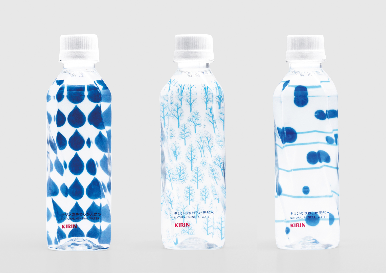 Kirin Natural Mineral Water is a bottled water product sold only via an e-commerce website. Since the water is delivered, customers do not have to carry any water crates. Thirty 310 ml bottles with six different designs are assorted in one crate. To blend in with various kinds of interiors, the bottles featuring a blue print show motifs of water in nature. Only one side of the bottle displays the product name printed in a small font, so that the patterns on the back are seen through the refraction of the mineral water. The patterns look different depending on the angle and the movement of the water.