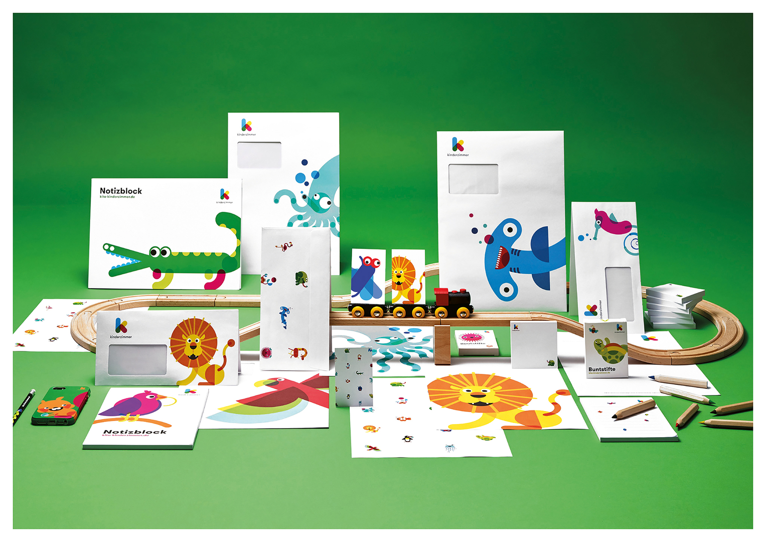 The design of the new corporate identity for the Kita kinderzimmer day-care centre merges simplicity with joy and playfulness – exactly what distinguishes a day-care centre. The elements derived from the logo cleverly re-emerge in the various illustrations and icons, which not only lends the identity an overall appeal that is thoroughly coherent, clear and forms a unity, but which also promises joy and a lot of fun.