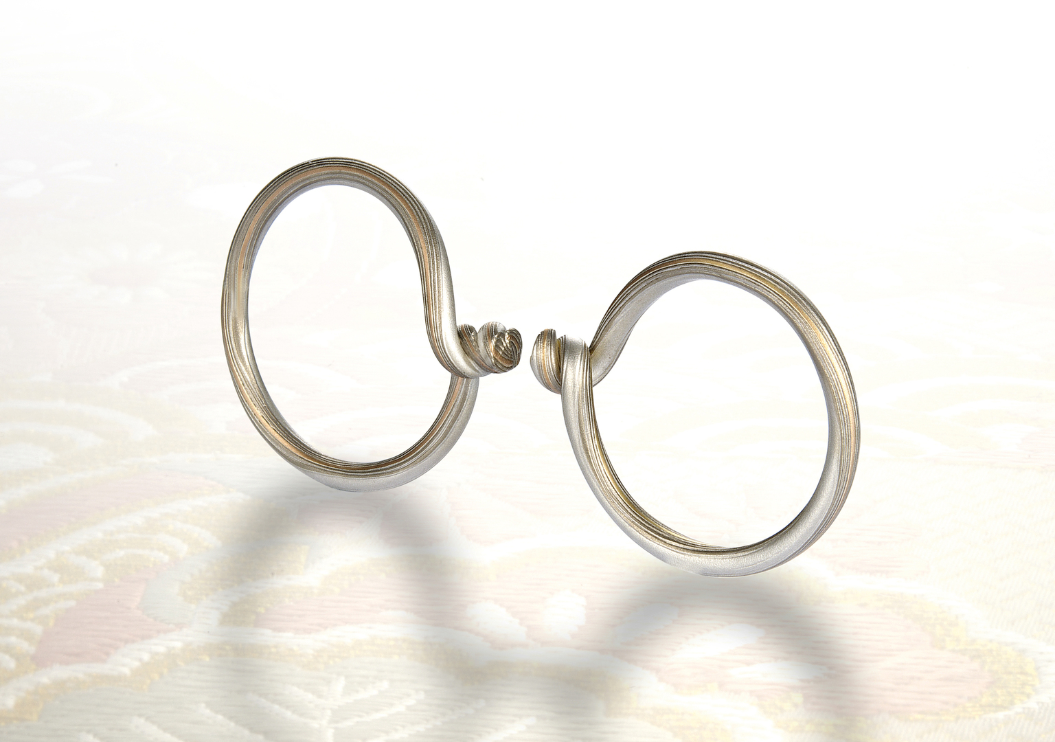 The Kizuna (Nejiru) wedding rings are created using the 400-year-old Japanese blacksmithing technique of “Mokume-Gane”. In this process, thin metal sheets are laminated together into a block, with the different coloured sheets creating fine lines. The block is then formed into a large ring, which is twisted and separated into two rings that are, in turn, shaped further. The rings thus embody the meaning of a bond – one that symbolises not the state of a completely sound connection but rather the will to keep this connection alive.