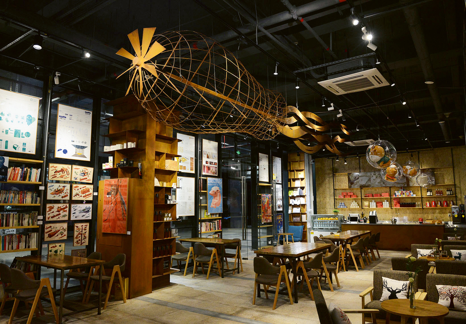 The design for this bookstore adopts an industrial style, using weatherproof steel throughout the space. The space pillars are also wrapped in this material and function as display frames. Another key design element is the ceiling theme, modelled as a big octopus equipped with multiple antennae that symbolise “the diversity of knowledge”. Made of a steel skeleton and solid wood, the bookshelves create an astonishing effect, for they look as if they were breathing. The space between the bookshelves is filled with steel mesh and serves as a display background. Taking into account many merits, this bookstore is also a book bar and an art exhibition hall.