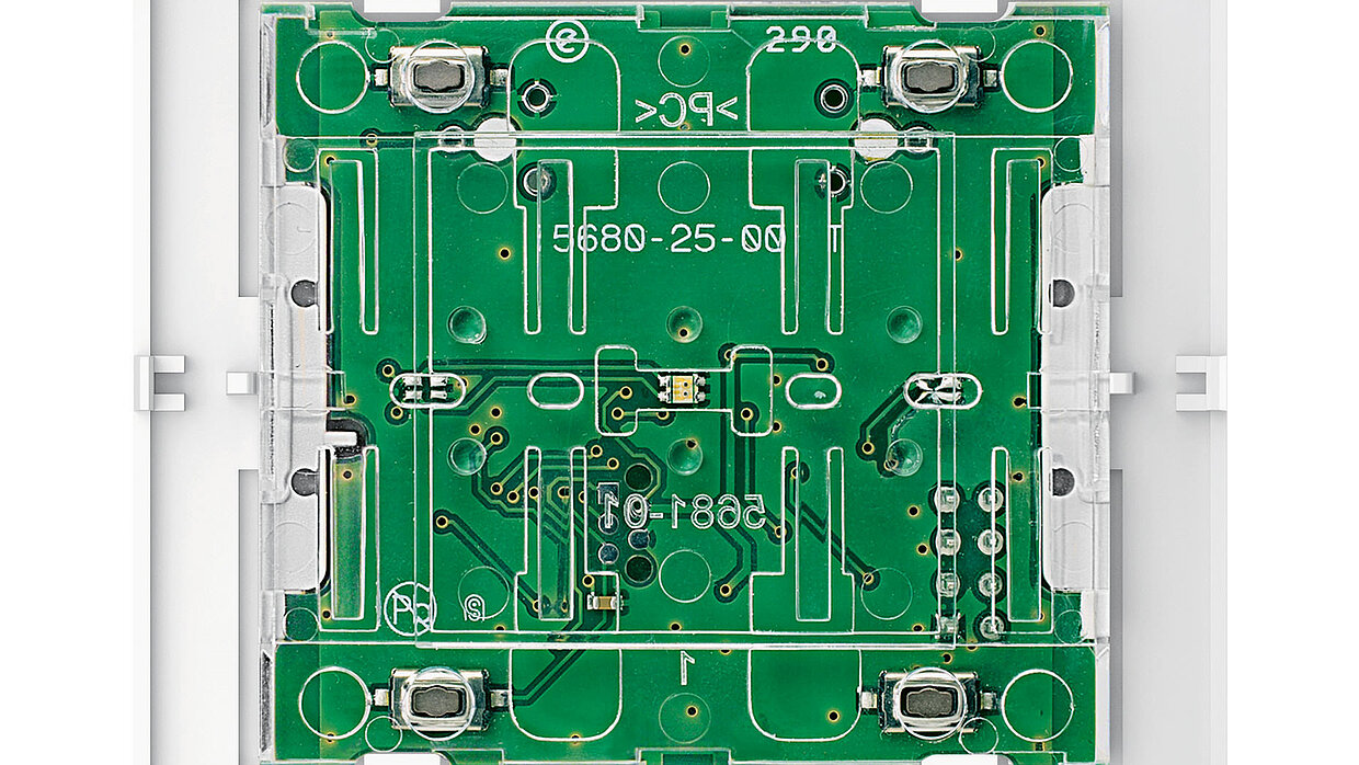 With its glossy black surface, the KNX Multi-Touch Pro somewhat resembles a smartphone or tablet. The functions of this home automation device are intuitive to operate via large format icons and controls. Swiping allows users to switch between the eight different key functions. The special feature of this home automation device is gesture control. Functions can be selected and activated by the directional movement of the hand. Amongst other things, this smart device enables adjustment of the slats in a window blind, the lights or the room temperature.