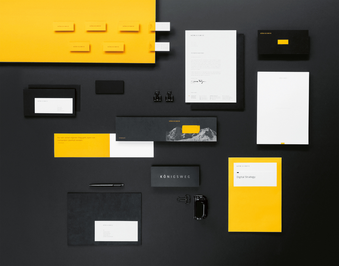 The visual corporate identity developed for this strategic management consultancy was supposed to creatively reflect the entrepreneurial values, the work and the consulting approach, as well as the characteristics of the company, visualising everything in a tangible manner. The name conveys a high standard: KÖNIGSWEG (Silver Bullet) hints at the best way to find a solution by considering all relevant factors and aspects. The corporate design is characterised by being distinct and bold. Its striking, contrasting colour code yields a high recognition value. In addition, a rectangle in a strong colour contrast is used as a key element for communicative clarity.
