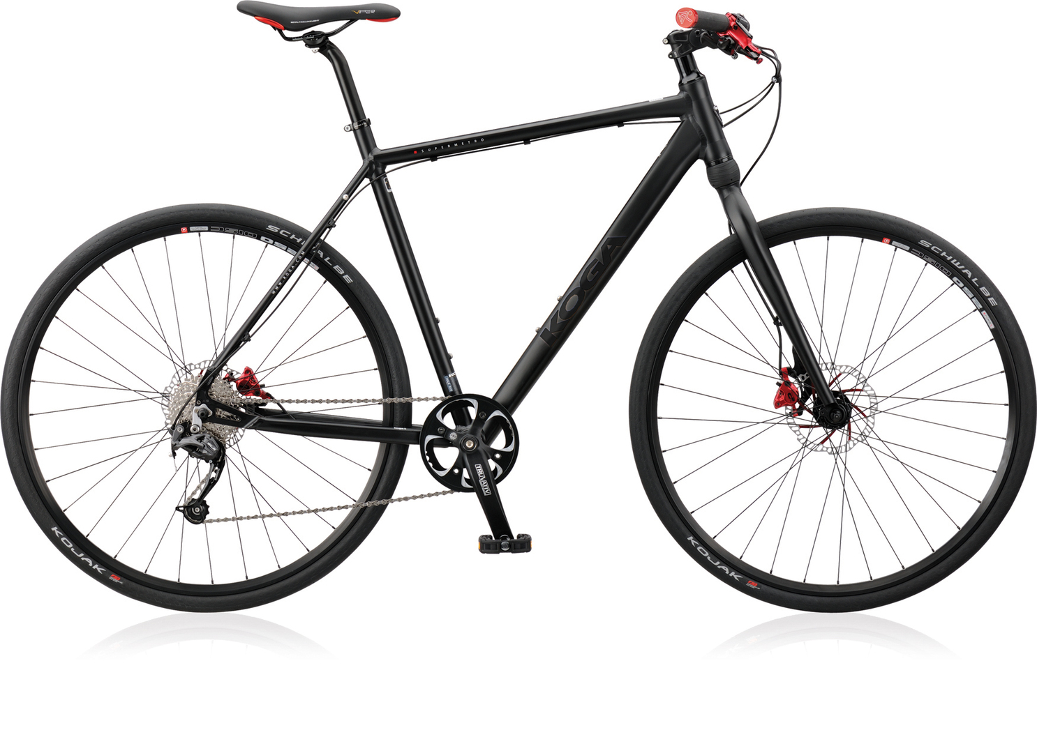 The SuperMetro is a trendy “naked bike” for cyclists who value lifestyle and comfort, with red styling elements lending the bike a special look. The smoothly welded 6069 alloy frame guarantees – together with internal cable routing, an integrated headset, and built-in fork suspension – a sporty and comfortable ride. Features such as disk brakes, Shimano SLX derailleurs, and wheels with 35-mm Schwalbe Kojak tyres promise superb performance.